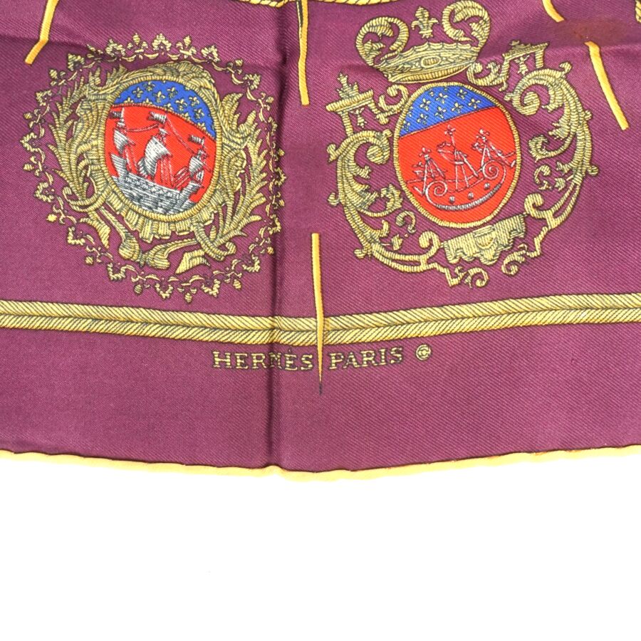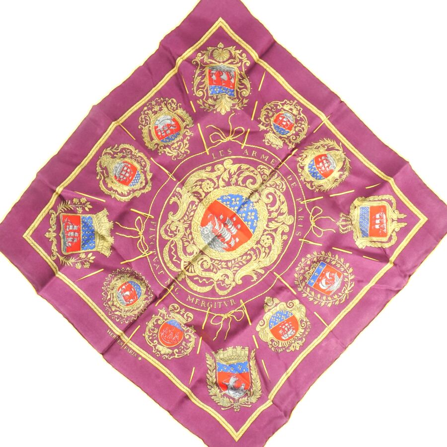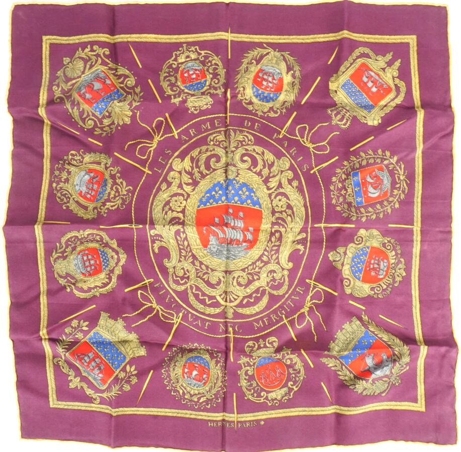 HERMÈS : Carré de soie "Les armes de Paris" à motif polychromes doré, bleu et rouge sur fond violet, signé, Dim. 41 x 41 cm (petites traces).