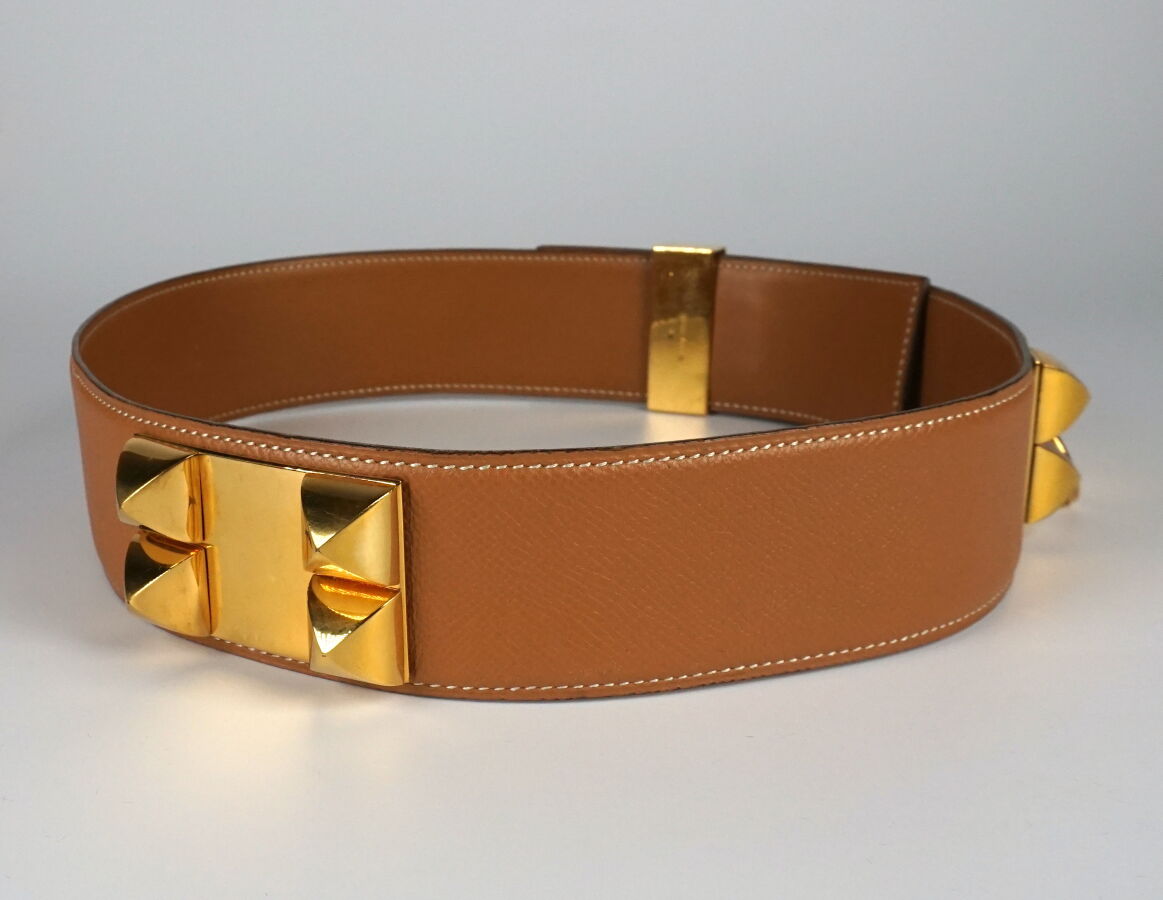 HERMES : Ceinture "Collier de chien" en cuir camel, ornée des clous "Médor" et d'un anneau en métal doré, fermeture par boucle de serrage, signée, lettre "R" dans un rond (1988), Lar. 5 cm, T. 74 (usures d'usage).