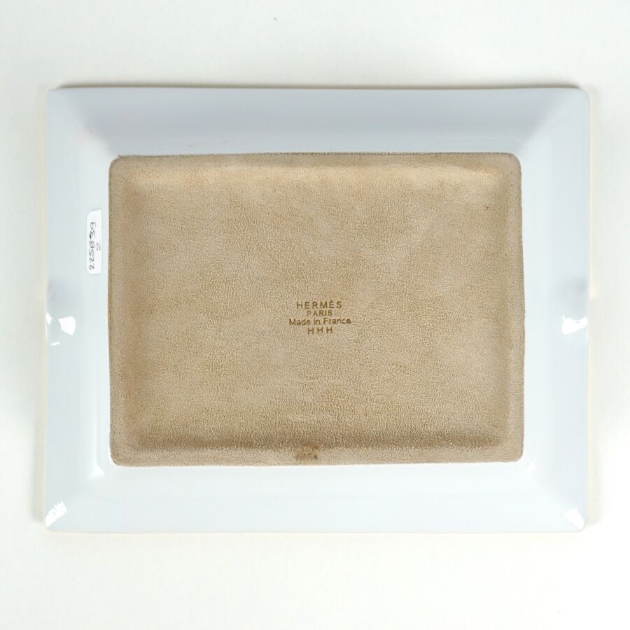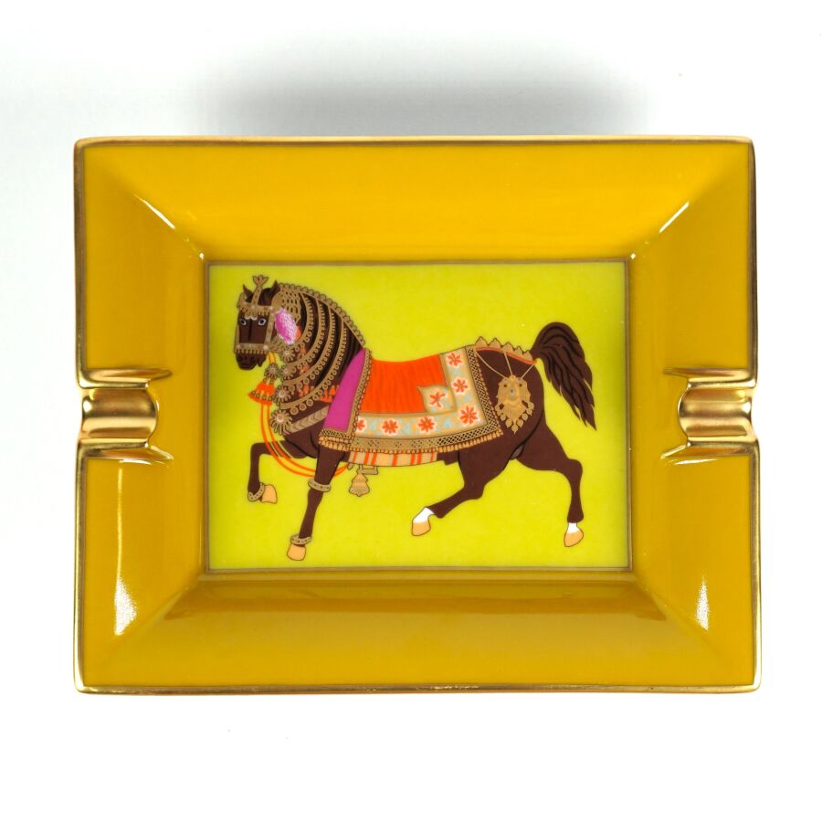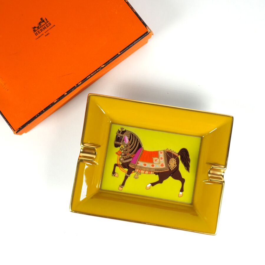 HERMES : Cendrier en porcelaine émaillée polychrome et rehauts d'or à décor dans le bassin d'un cheval arabe, marqué sous la base, Dim. 16.2 x 19.8 cm (avec sa boite, boîte en l'état).