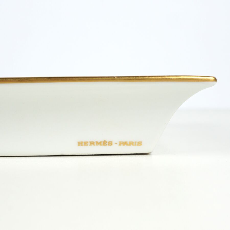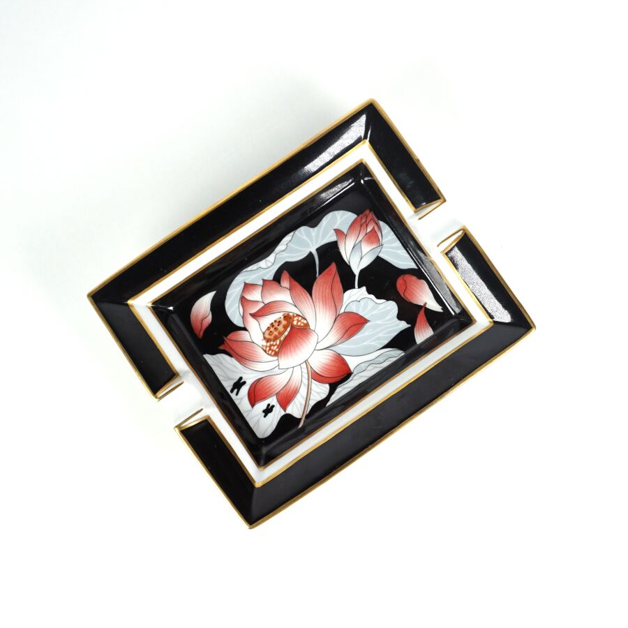 HERMES : Cendrier en porcelaine émaillée polychrome et rehauts d'or à décor dans le bassin d'une fleur de nénuphar, marqué sur la base, Dim. 16 x 19.8 cm (sans boite).