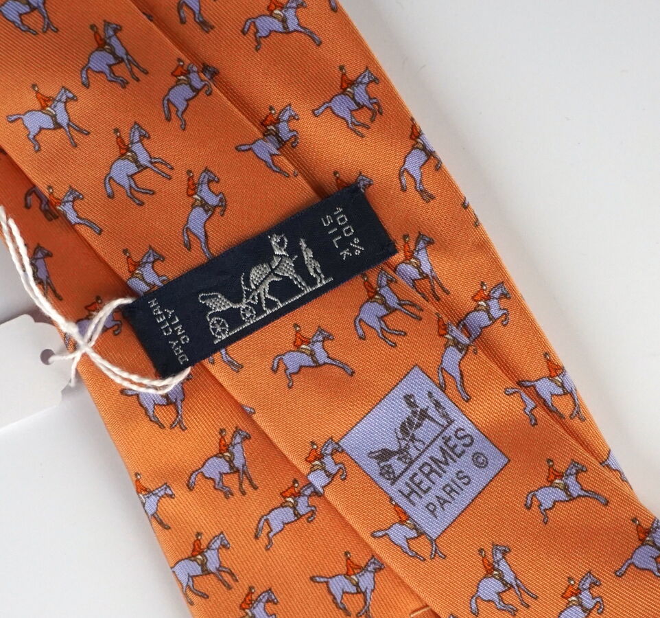 HERMES : Cravate en soie, à décor de chevaux et cavaliers à l'obstacle, bleu-gris sur fond orange (bel état).