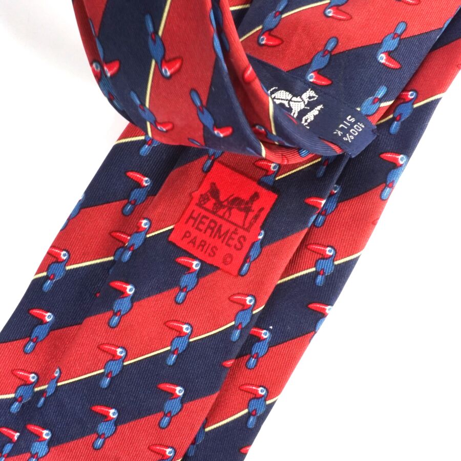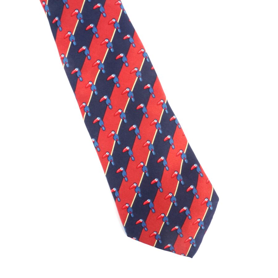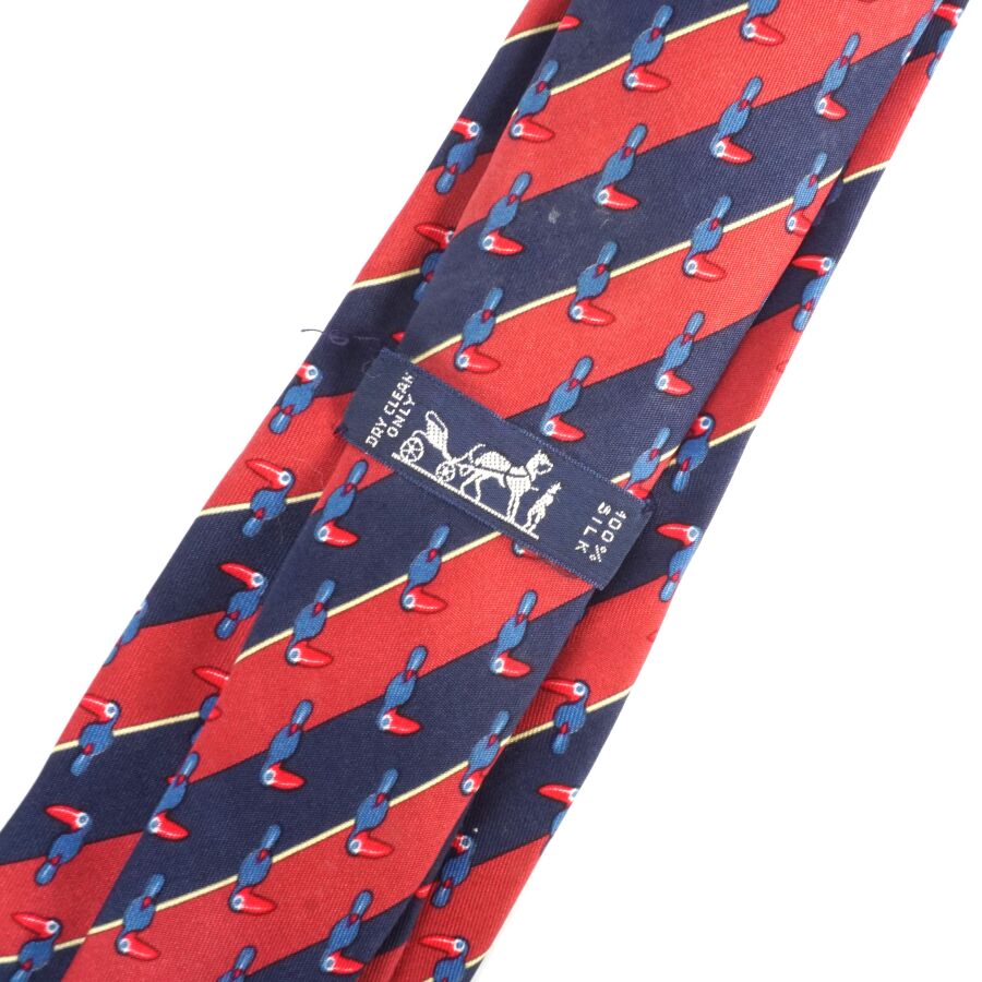 HERMÈS : Cravate en soie à motif en bleu et rouge de toucans sur fond rayé bleu nuit, rouge et jaune, étiquette signée, Larg. 8 cm (petits fils tirés, étiquette partiellement décousue).