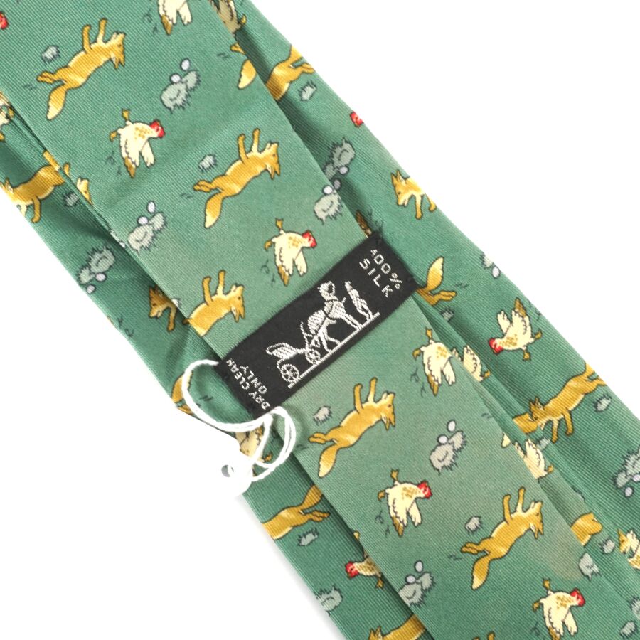 HERMÈS : Cravate en soie à motif polychrome d'un renard et d'une poule sur fond vert amande, étiquette signée, Larg. 9 cm.