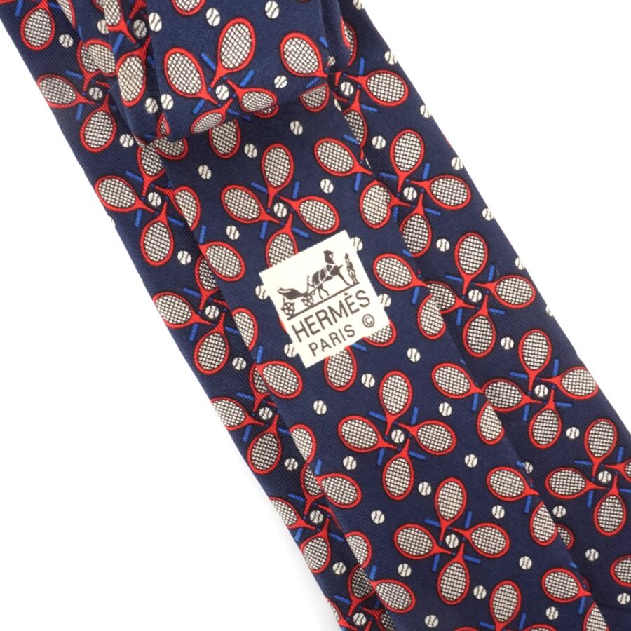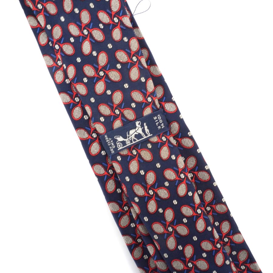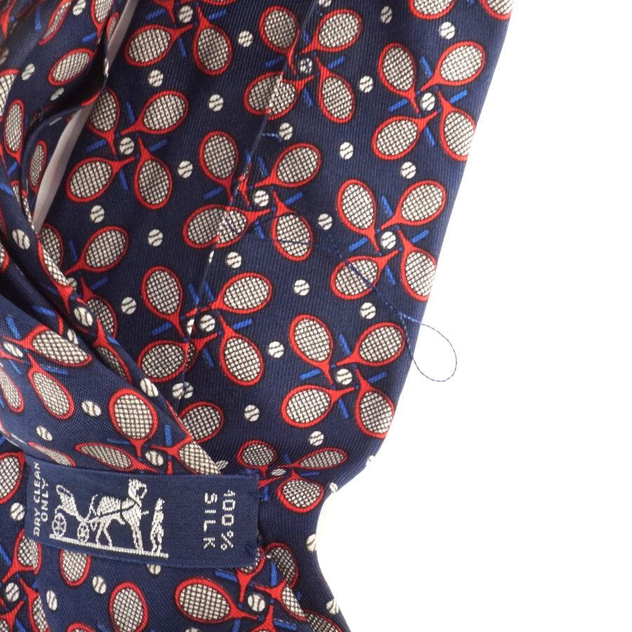 HERMÈS : Cravate en soie à motif rouge et beige de raquettes sur fond bleu nuit, étiquette signée, Larg. 8 cm (fil tiré).