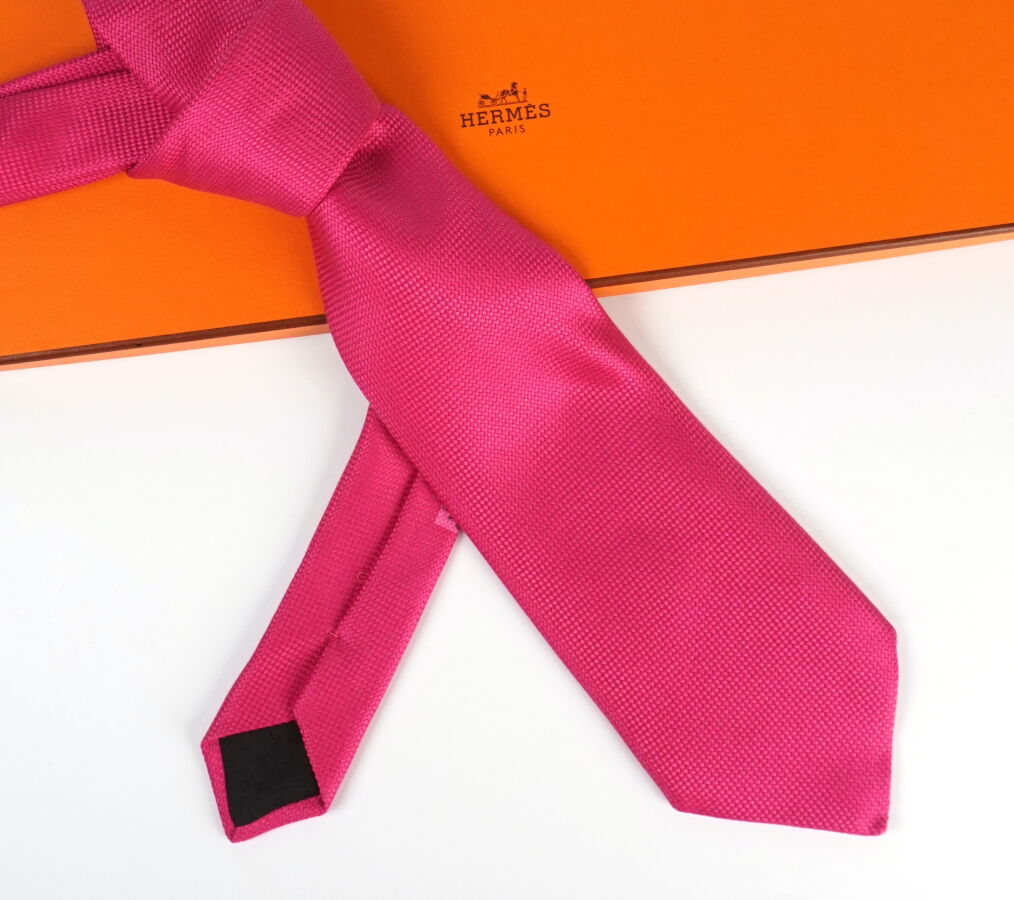 HERMES : Cravate en soie rose fuchsia, signée, Lar. 9 cm. Présentée dans sa boite siglée.