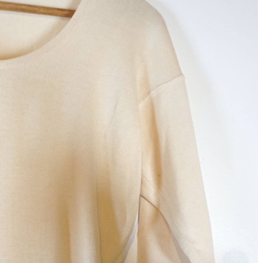 HERMES : Ensemble de 3 tops ivoire, probablement en mélange coton, comprenant un top manches longues (T. S indiquée), un top manches 3/4 (T. S environ) et un col roulé (T. M indiquée) (quelques traces).