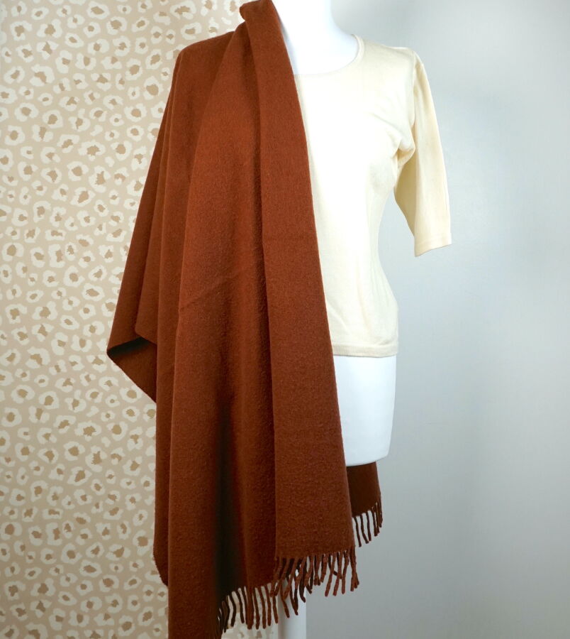 HERMES : Grande écharpe à franges, en cachemire marron-cognac, signée, 180 x 72 cm environ (bel état).