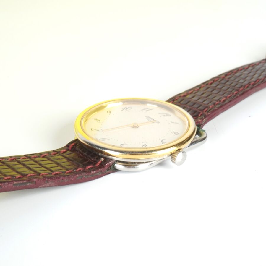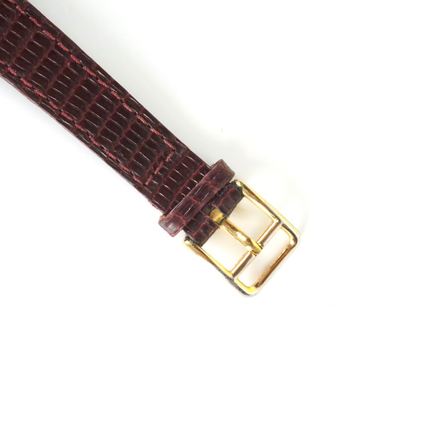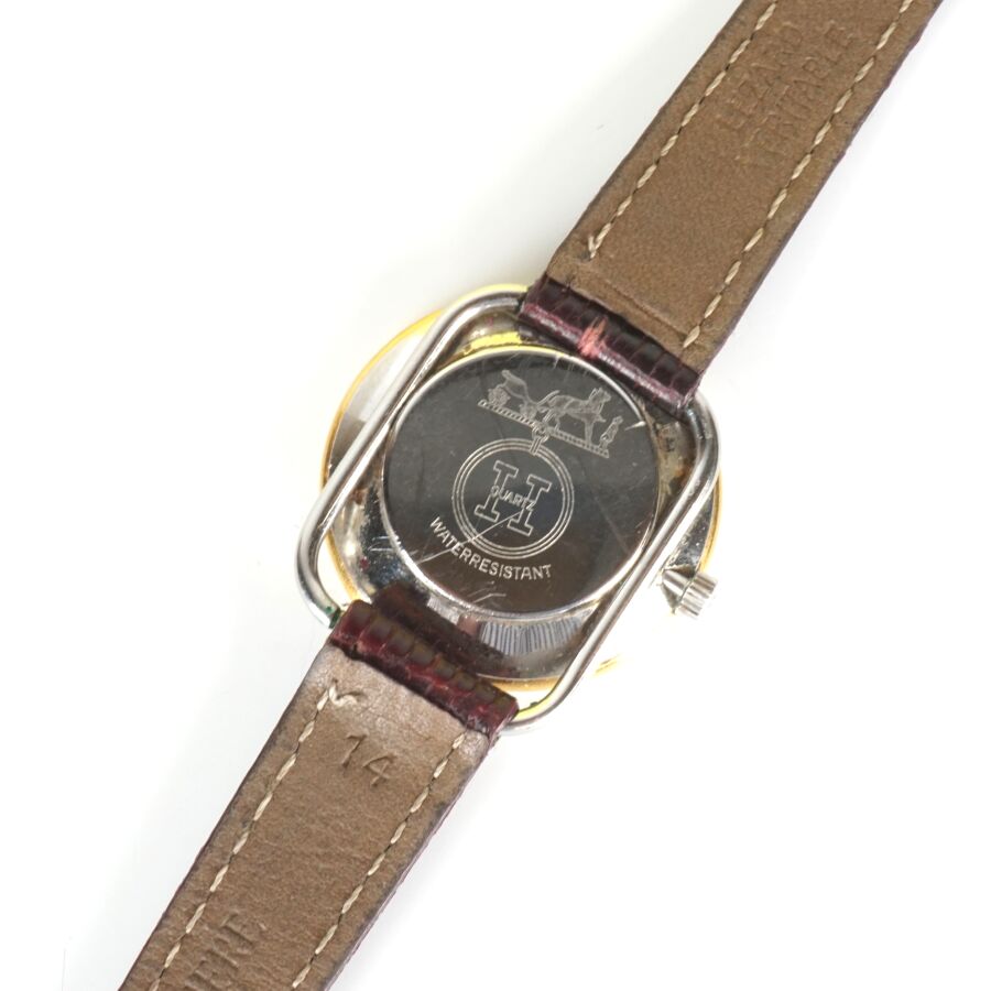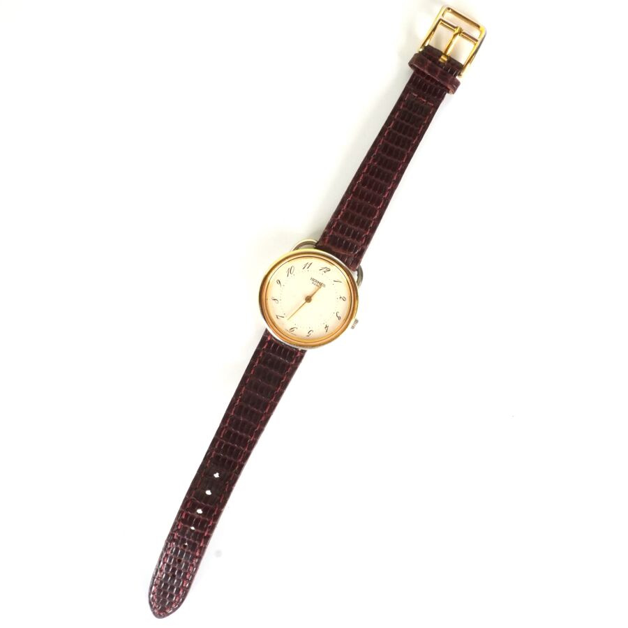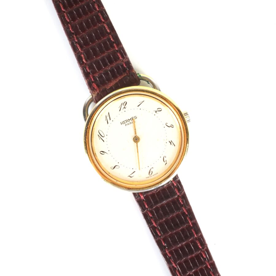 HERMÈS : Montre bracelet modèle "Arceau", acier chromé et plaqué or, boîtier rond, cadran blanc signé, chiffres arabes pour les heures, fond logoté, mouvement à quartz, bracelet en lézard brun et boucle ardillon en métal doré (rapporté), Diam. Boîtier : 3 cm. L. Totale : 21 cm (petites usures d'usage).