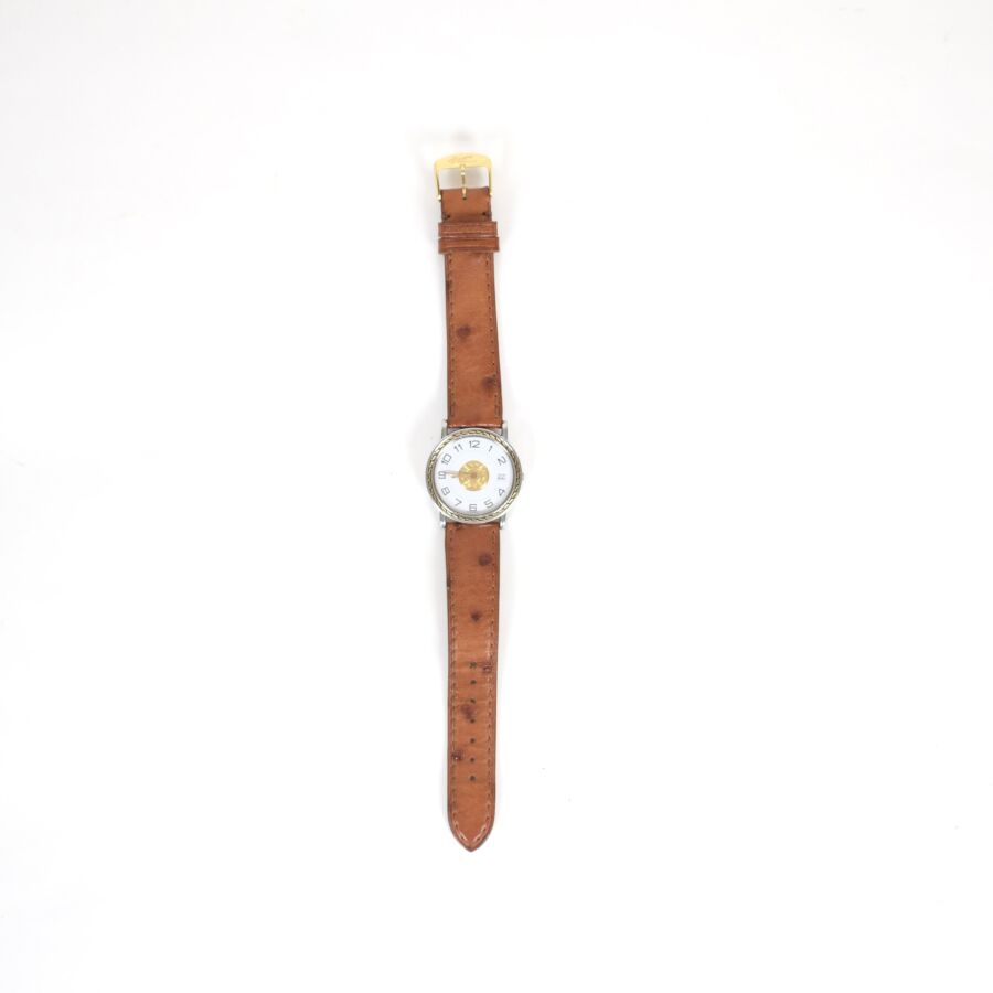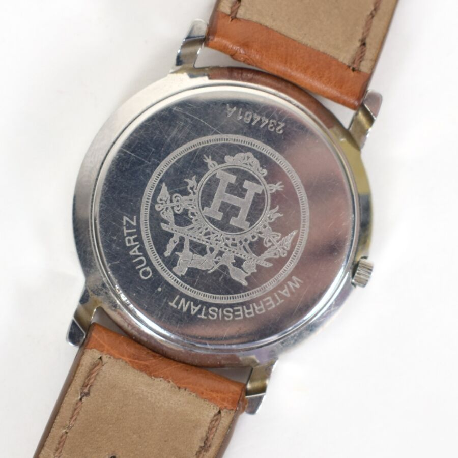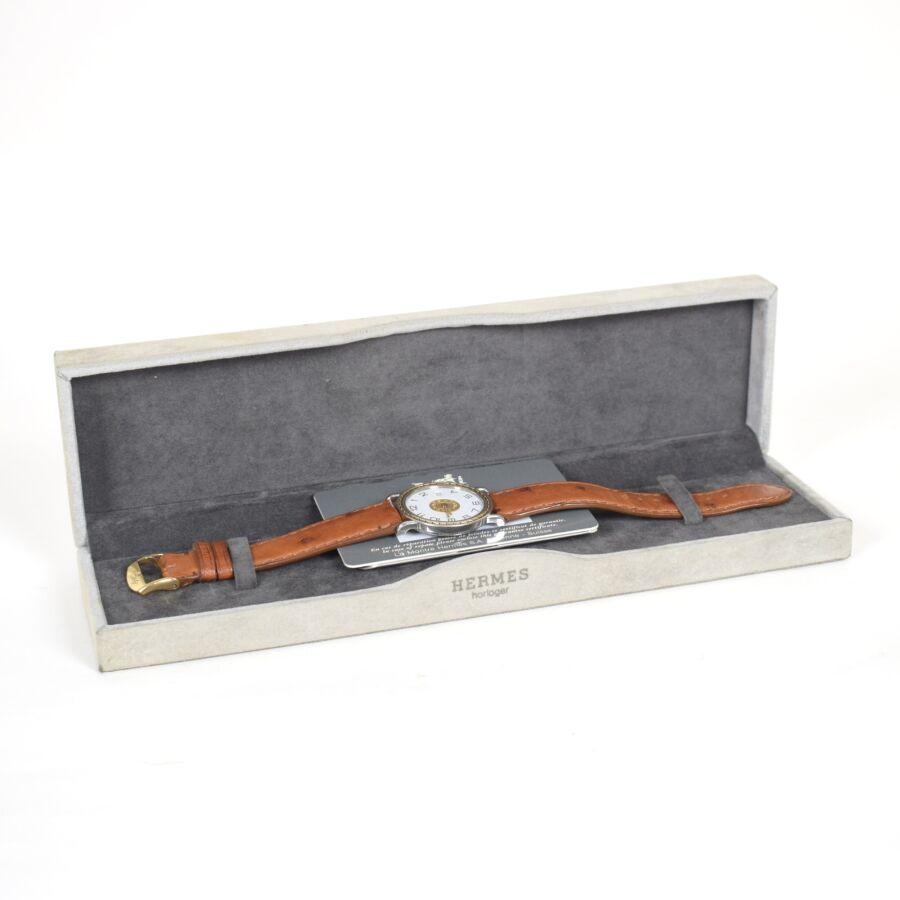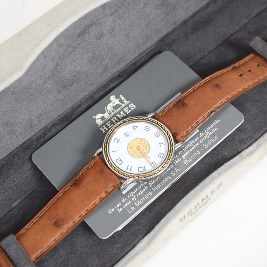 HERMES : Montre modèle "Sellier", boîtier rond en acier et acier doré, lunette décorée de surpiqûres, cadran blanc et doré à chiffres arabes, minuterie chemin de fer et guichet dateur à 3h, bracelet en cuir d'autruche et boucle ardillon en métal doré, mouvement à quartz, cadran, dos, couronne, fond, mouvement, bracelet et boucle signés, accompagné de son écrin d'origine. Diam : 34 mm. (usures au bracelet, petits chocs sur le boîtier en acier)