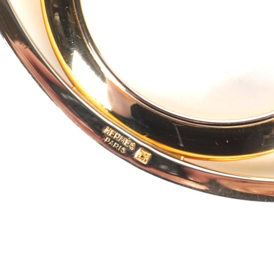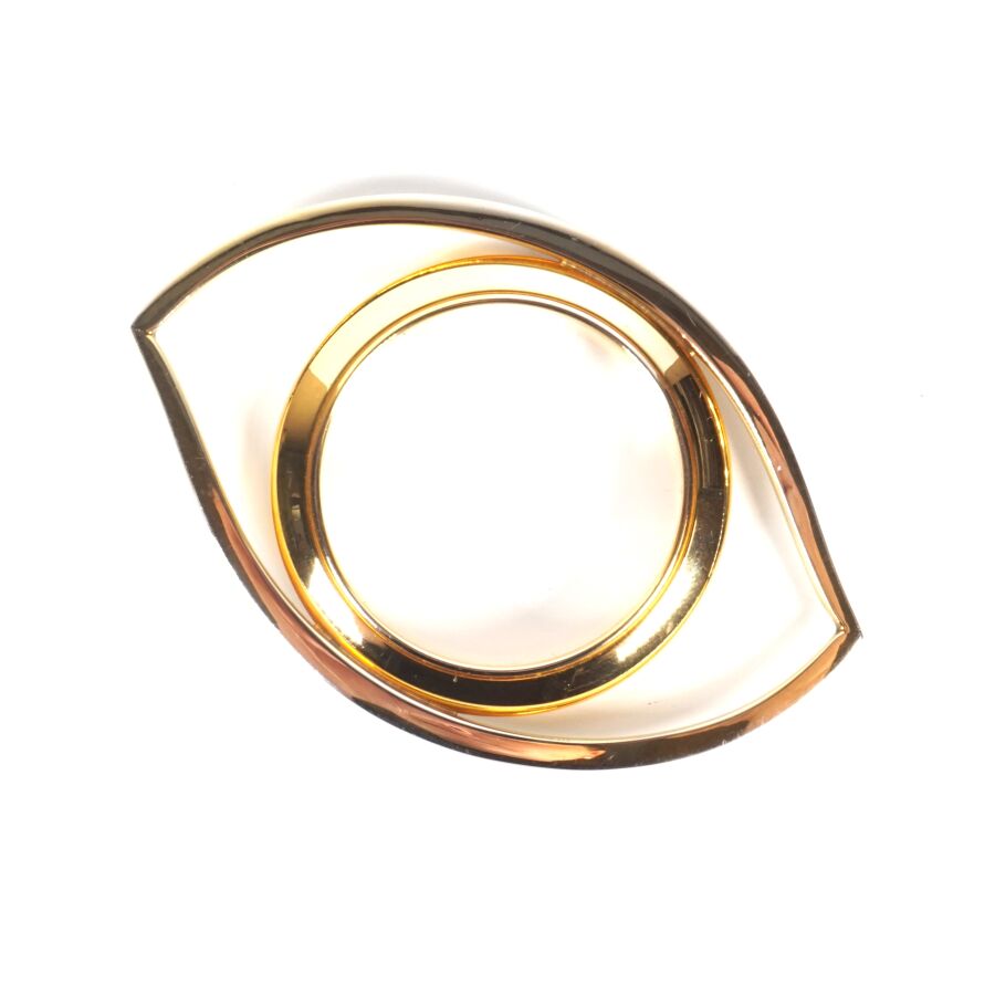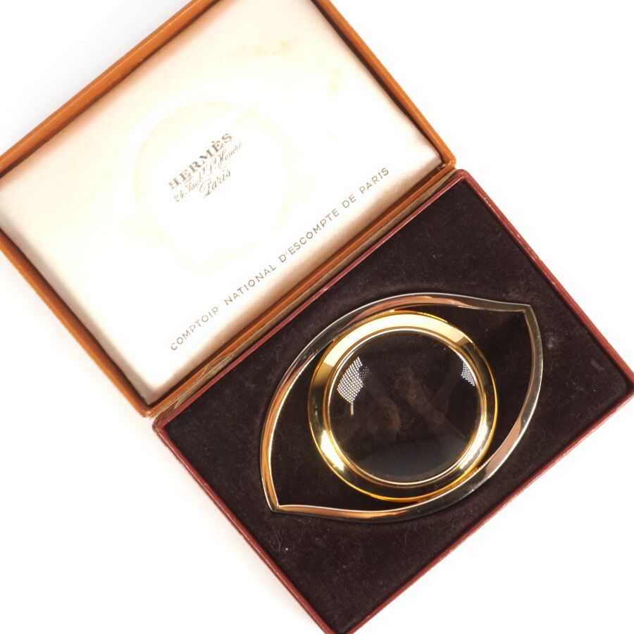 HERMES : "Oeil de Cléopâtre", oeil de bureau en métal doré et verre, signé, présenté dans sa boîte d'origine L. 10.5 cm x 7 cm.