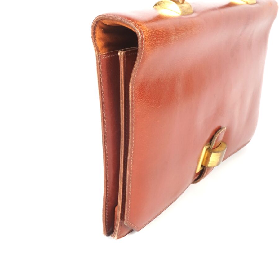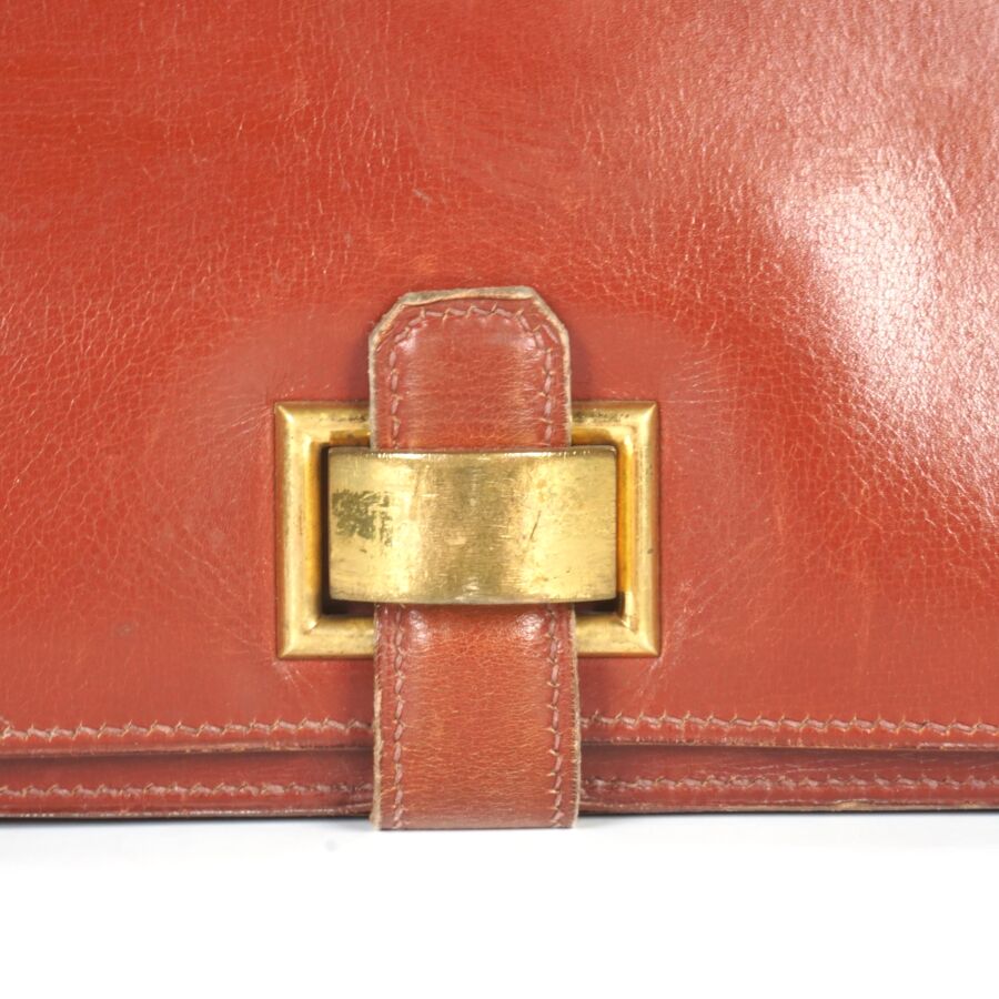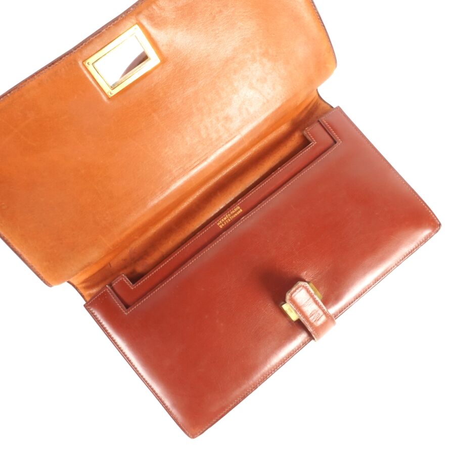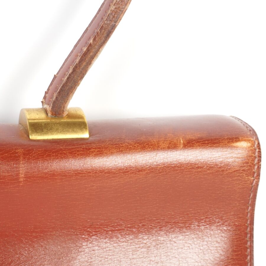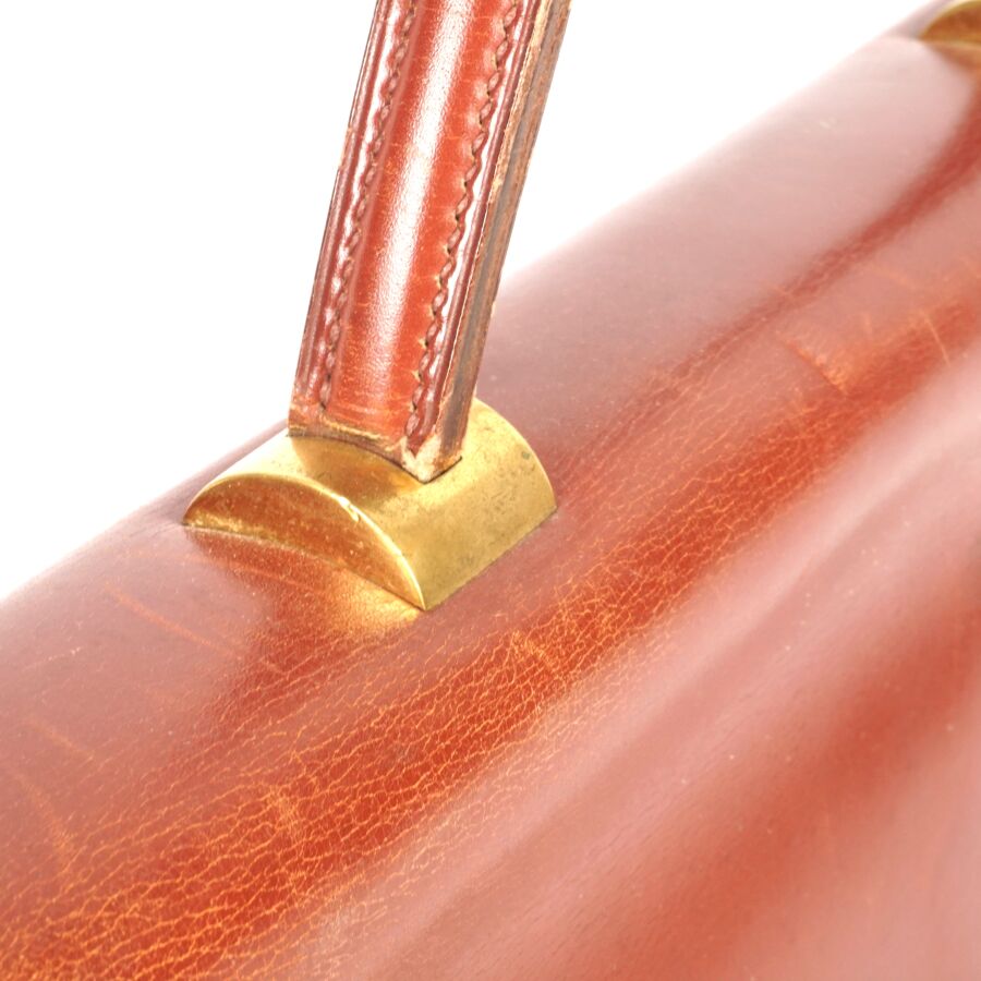 HERMÈS : Petit sac à main, modèle "Brio" en cuir lisse couleur cognac, fermeture à rabat et empiècement en métal doré, une anse pour un porté main, intérieur en cuir marron, pochette interne, fermeture par bouton pression, deux compartiments intérieurs, H. Avec anse : 30 cm. L. 28.5 cm. Larg. 2 cm (griffures et usures).