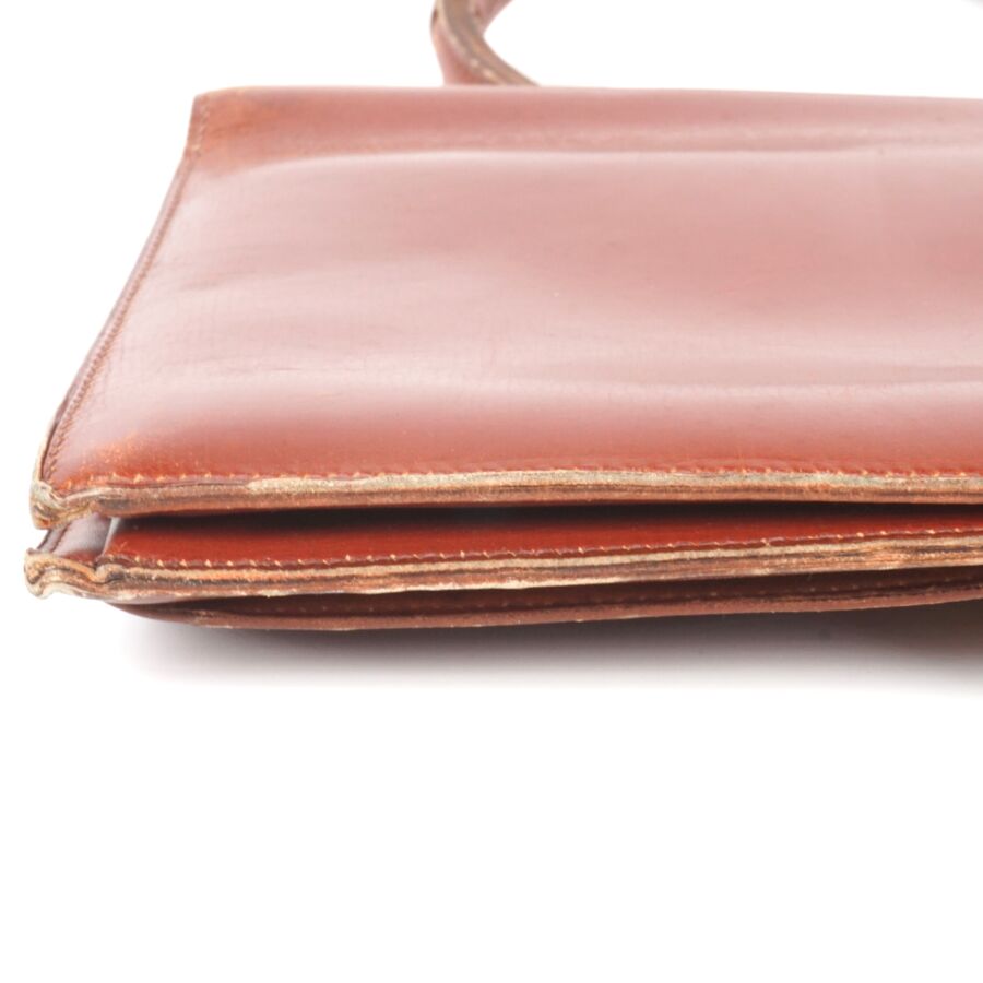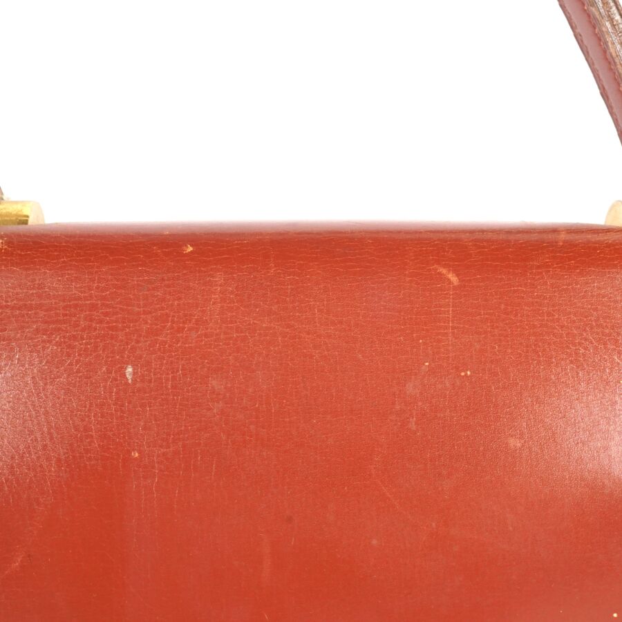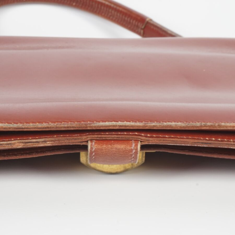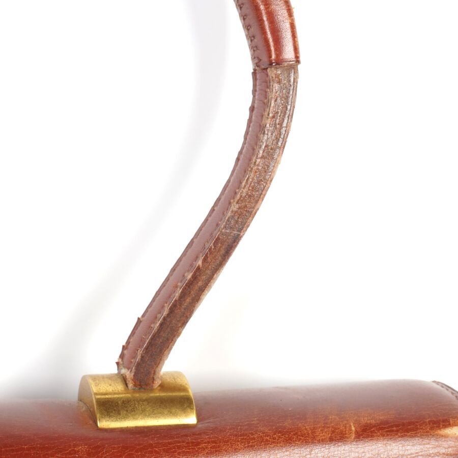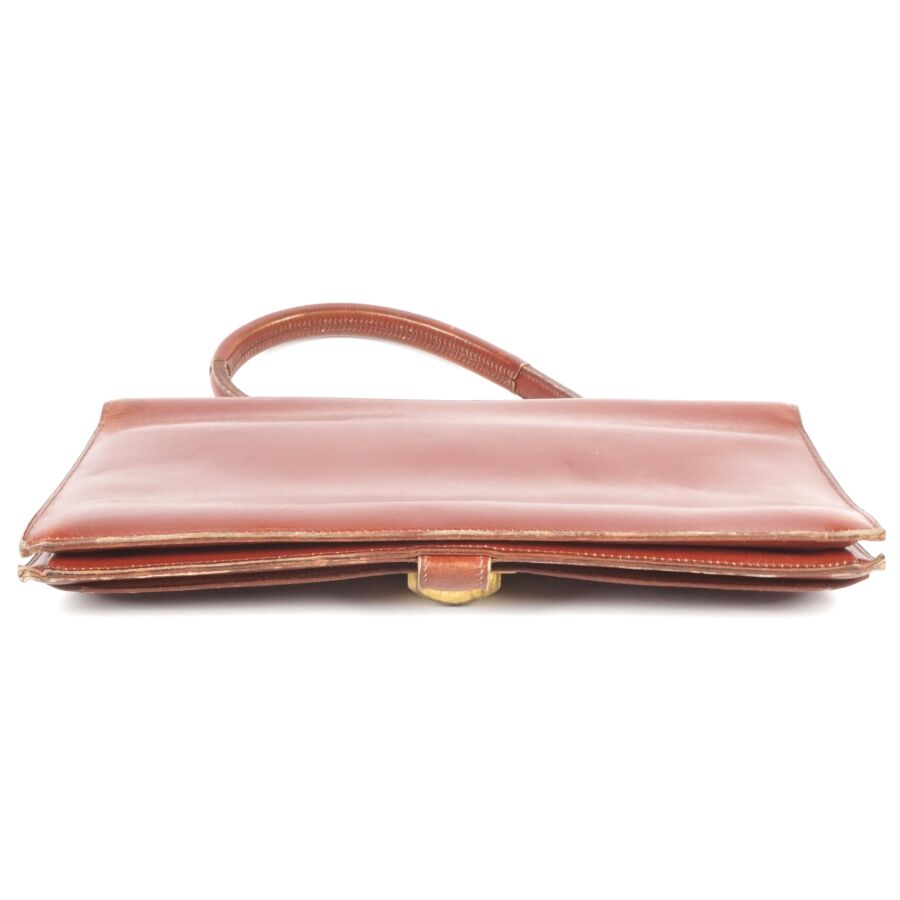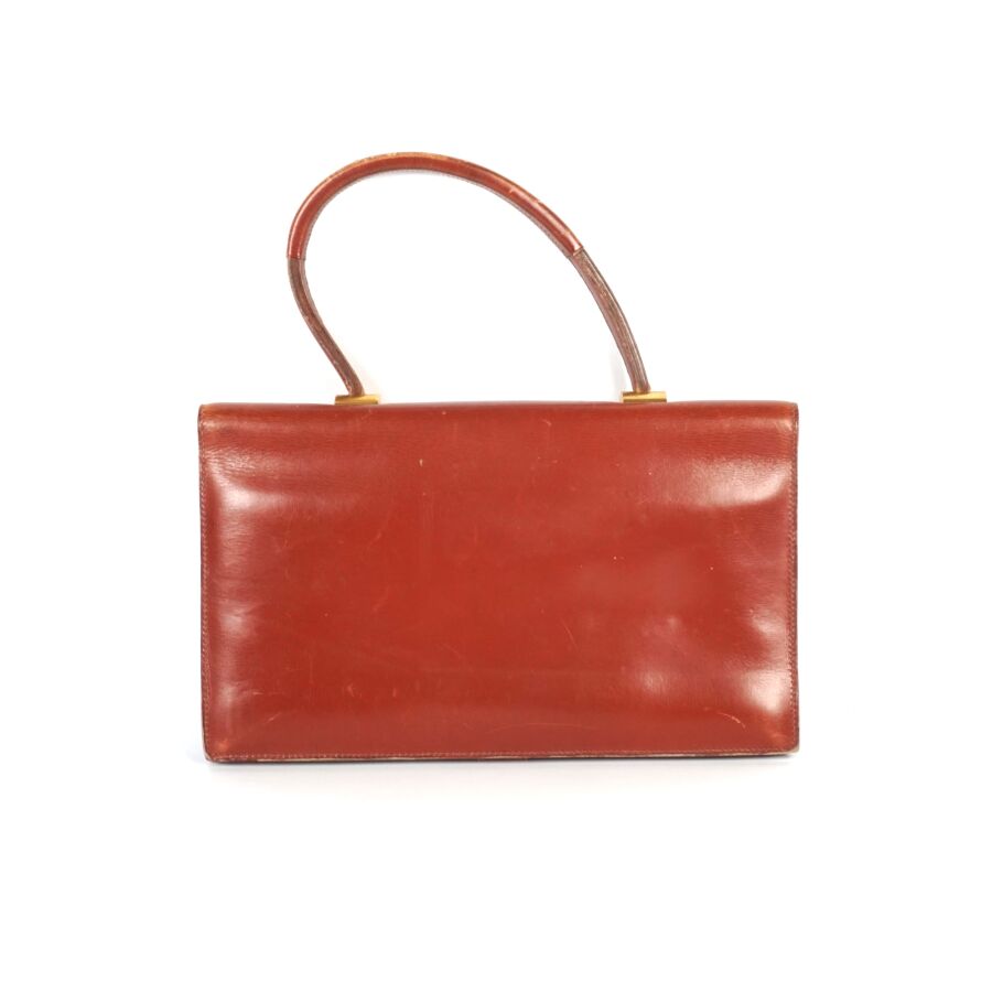 HERMÈS : Petit sac à main, modèle "Brio" en cuir lisse couleur cognac, fermeture à rabat et empiècement en métal doré, une anse pour un porté main, intérieur en cuir marron, pochette interne, fermeture par bouton pression, deux compartiments intérieurs, H. Avec anse : 30 cm. L. 28.5 cm. Larg. 2 cm (griffures et usures).