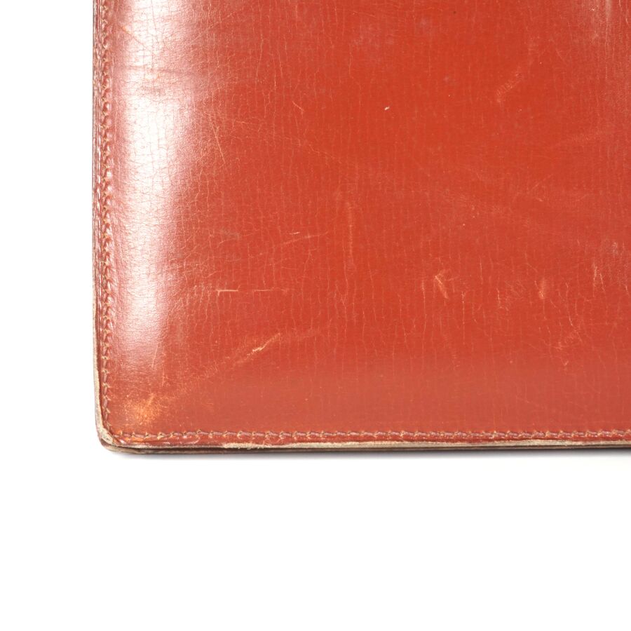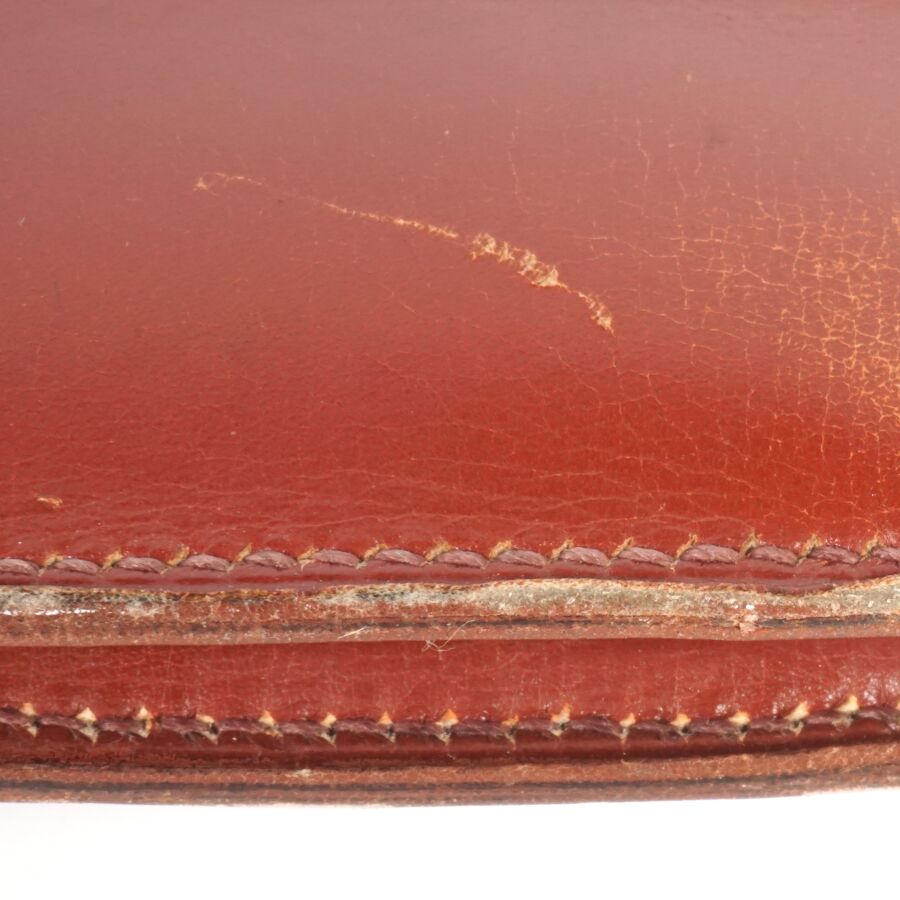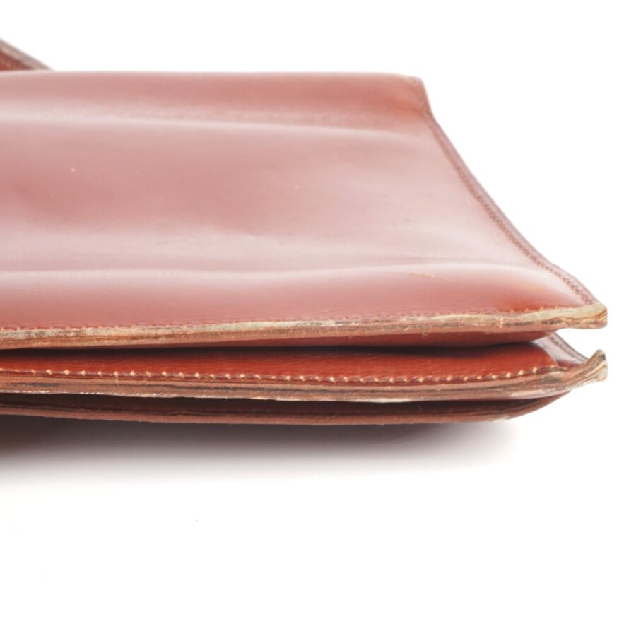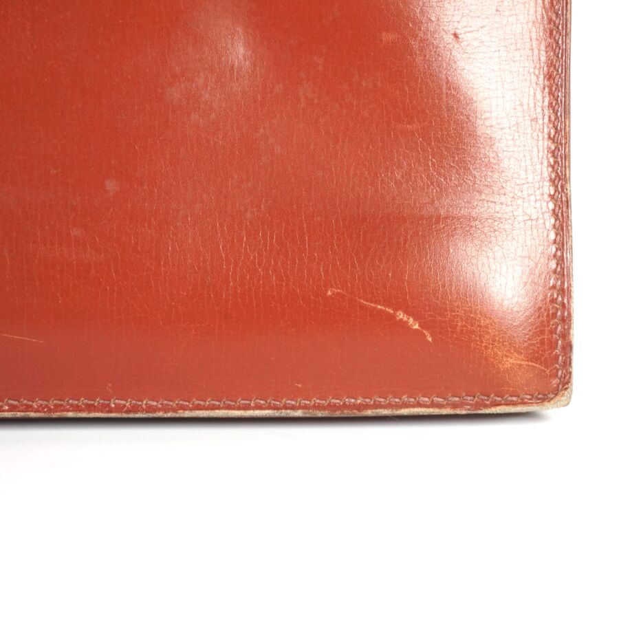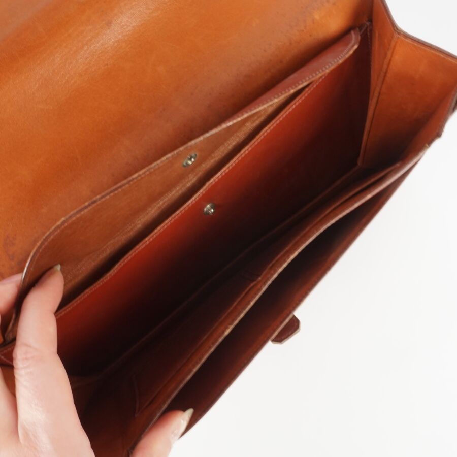 HERMÈS : Petit sac à main, modèle "Brio" en cuir lisse couleur cognac, fermeture à rabat et empiècement en métal doré, une anse pour un porté main, intérieur en cuir marron, pochette interne, fermeture par bouton pression, deux compartiments intérieurs, H. Avec anse : 30 cm. L. 28.5 cm. Larg. 2 cm (griffures et usures).