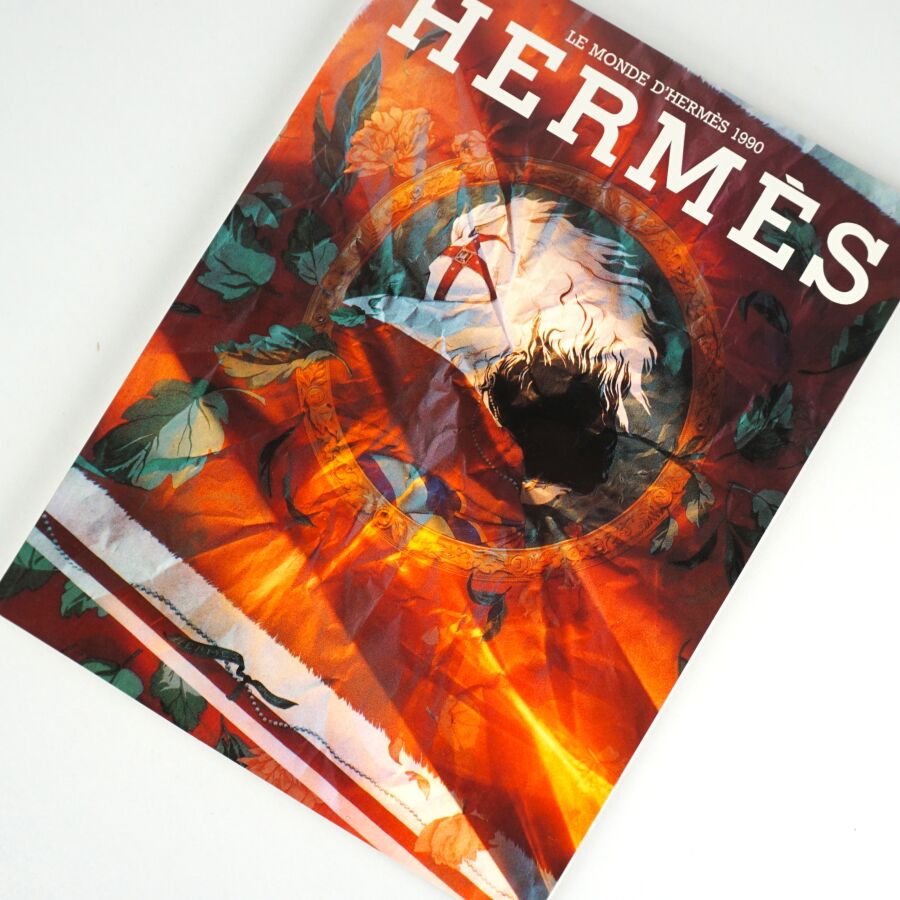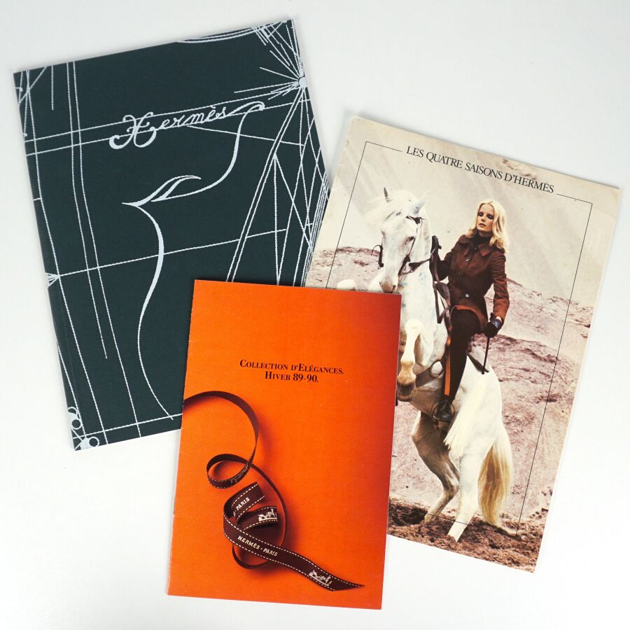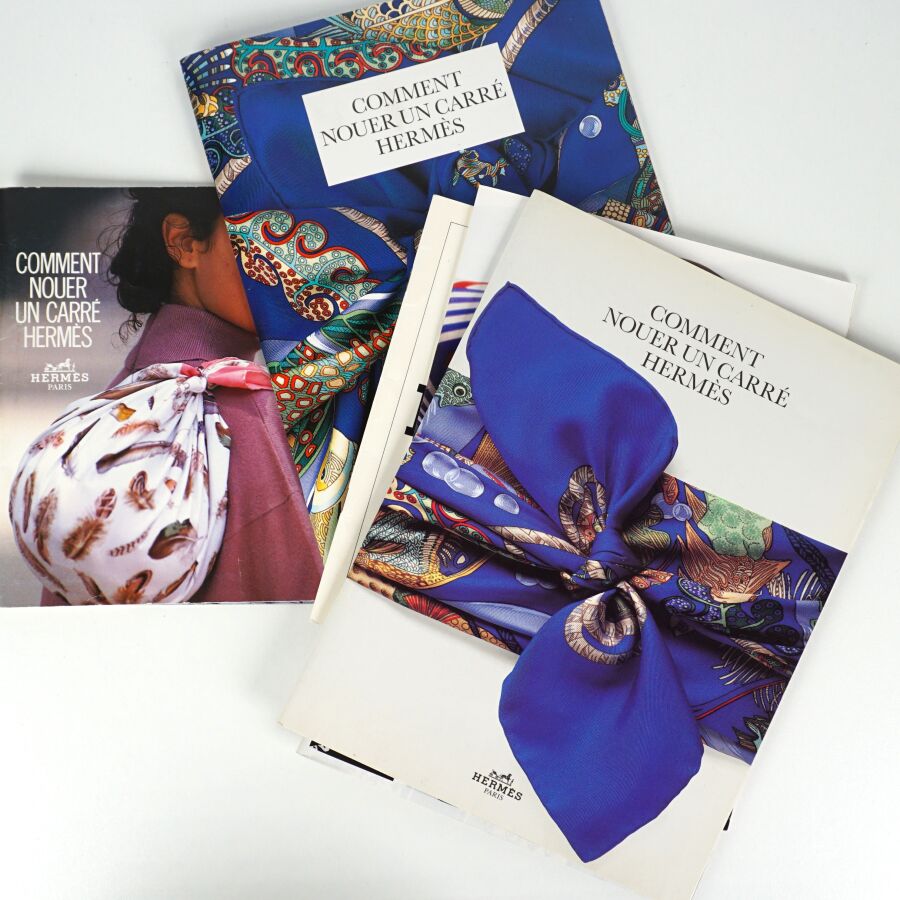 On y joint 3 catalogues de la maison Hermès (Collection d'élégances hiver 89-90, Les Quatre Saisons d'Hermès (1973), Le Carré d'Hermès Soie pour soi (1996)) et 6 brochures pour nouer son carré.