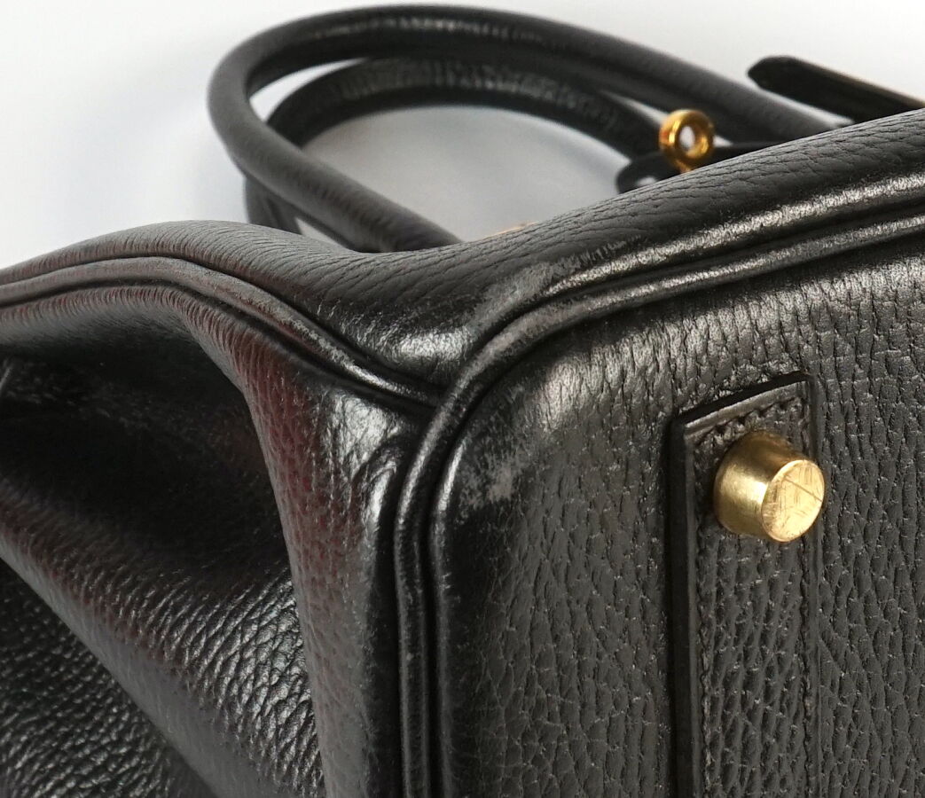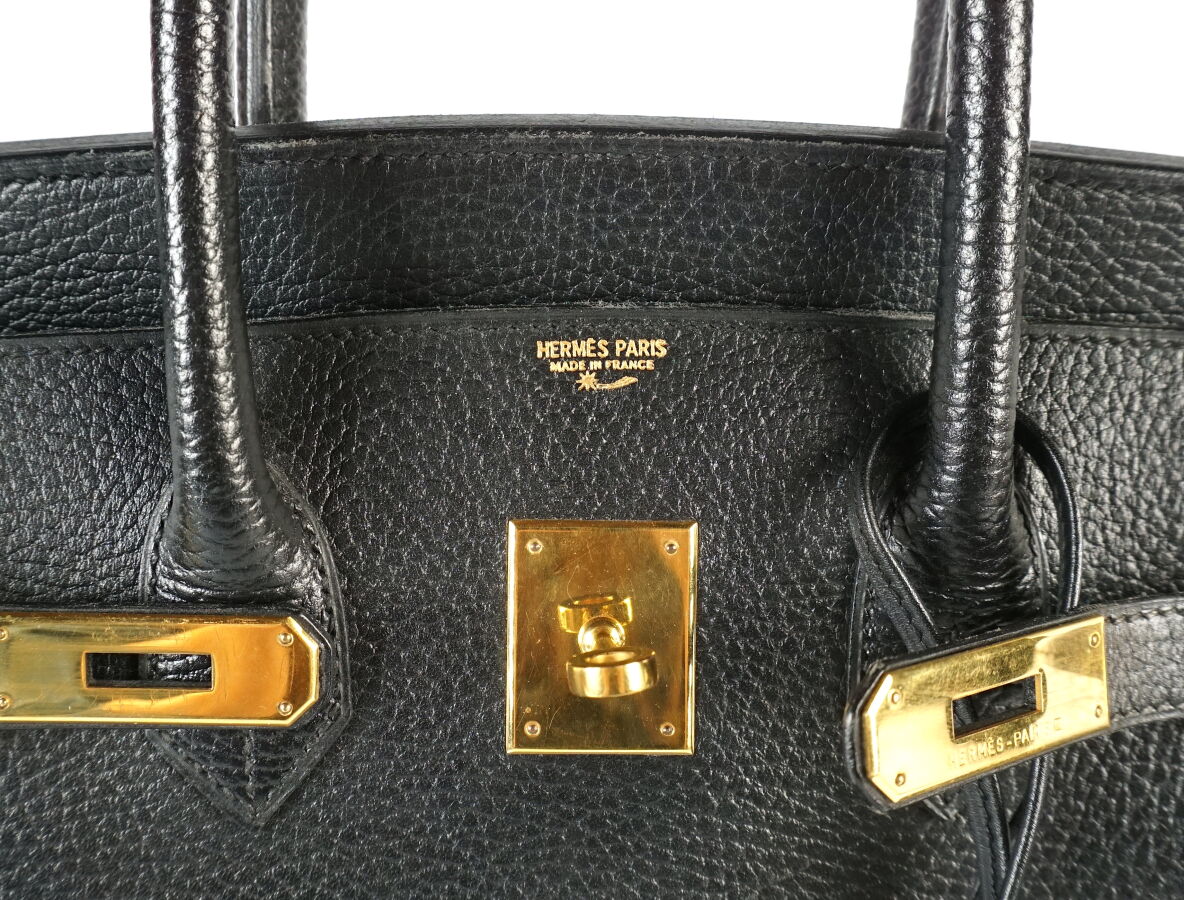 HERMES : Sac "Birkin" en cuir noir, intérieur bleu électrique, bijouterie dorée, avec tirette, clochette, clés et cadenas, signé "Hermès Paris Made in France" avec une étoile filante, la lanière présentant la lettre "Z" dans un rond pour 1996, L. 35 cm (quelques usures et griffures d'usage, notamment aux coins et aux anses, sinon bon état général).