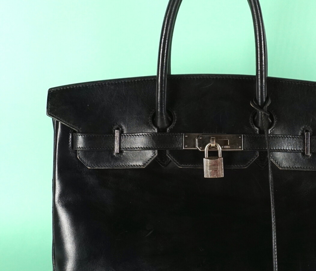 HERMES : Sac "Birkin" en cuir noir, une poche intérieure zippée, fermoir en métal et cadenas signés, lanière clochette et ses 2 clés, au revers d'une lanière la lettre "F", L. 35 cm.