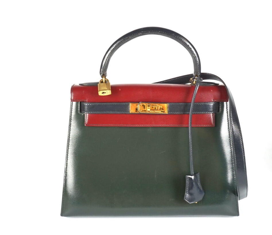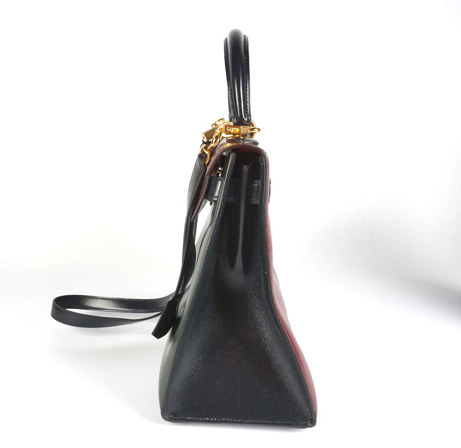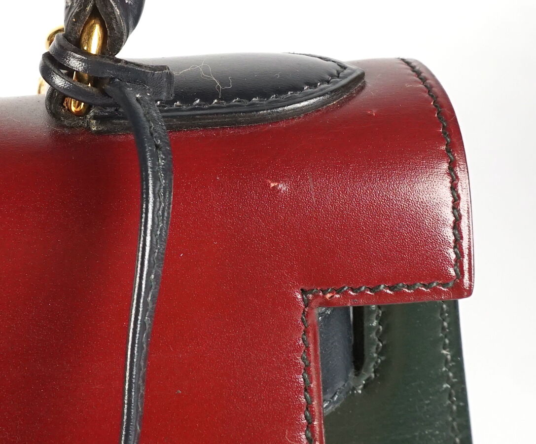HERMES : Sac "Kelly" en cuir tricolore, bijouterie en métal doré, bandoulière amovible, tirette, clochette, clés, cadenas, à l'intérieur un compartiment 3 poches dont une zippée, L. 29 cm.