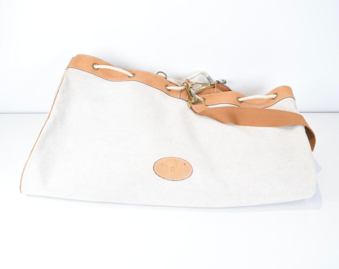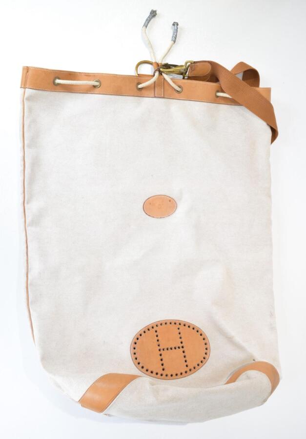 HERMES : Sac " Matelot " ligne Evelyne, en toile écrue et cuir lisse marron à bandoulière réglable, garnitures en métal, fermeture par lien coulissant, orné du "H" perforé et marqué d'une lettre initiale "D" en cuir appliqué, la lanière présentant la lettre "P" dans un rond pour l'année 1986, 84.5 cm x 65.1 cm, (salissures et taches sur la toile, usures sur le cuir, oxydation et usures sur les garnitures métalliques)