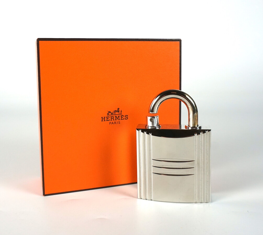HERMES : Vaporisateur de sac "Cadenas" rechargeable, en zamak, collection "Extrêmement Hermes - Les Extraits", comprenant le flacon "24 Faubourg" 7.5 mL. Présenté dans son coffret d'origine.
