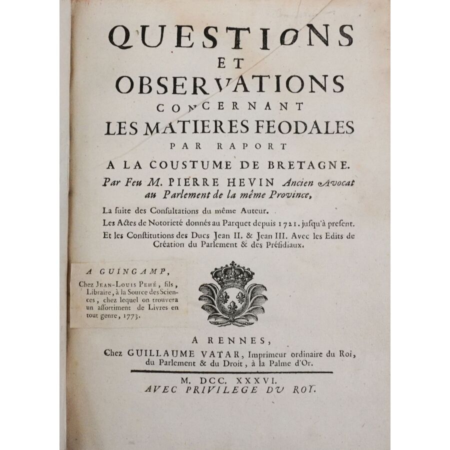 HEVIN (Pierre). Questions et Observations concernant les matières féodales par rapport à la Coutume de Bretagne. [...] Rennes, Vatar, 1736. In-4 basane brune, dos à nerfs orné, pièce de titre manquante (reliure de l'époque). Reliure usée, épidermures reteintées, traces de mouillures claires.