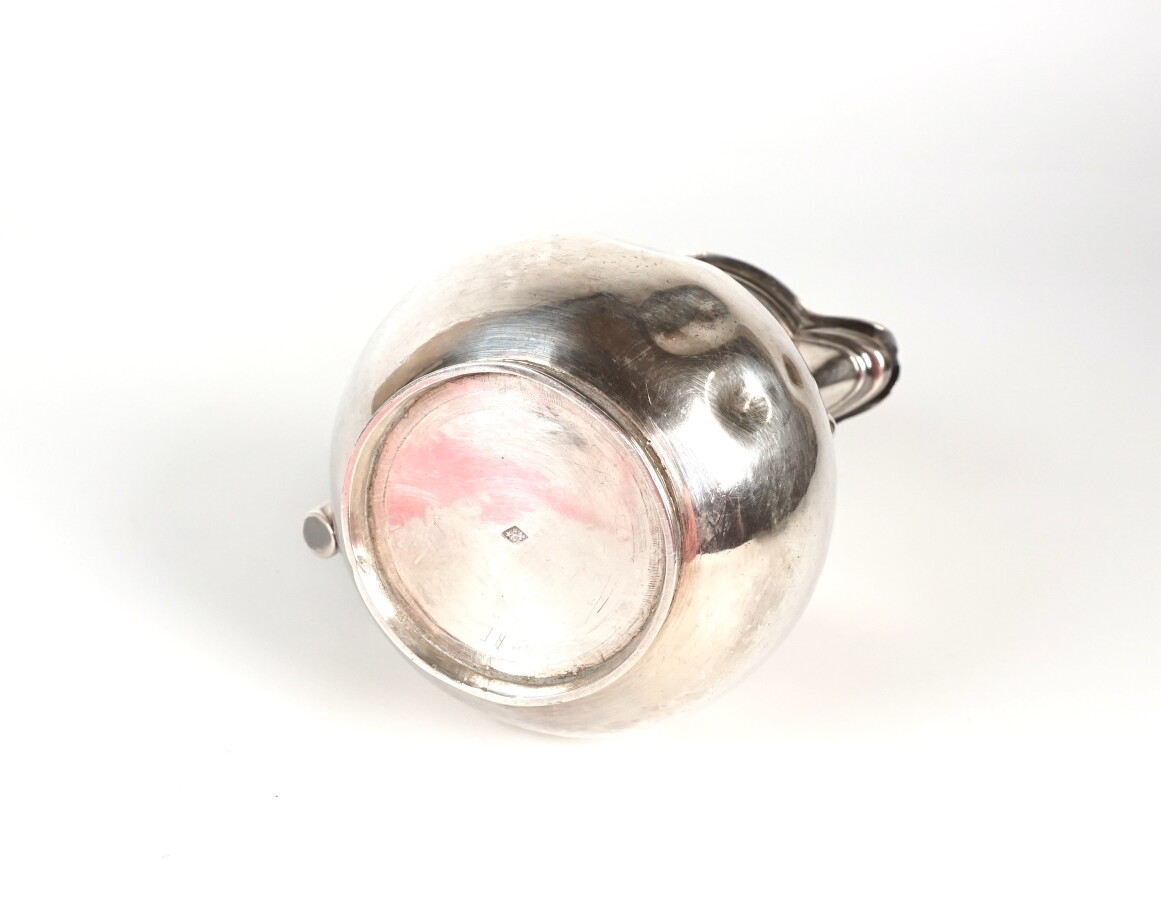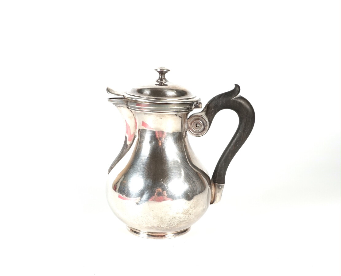 Hippolyte-Pierre BOMPARD (79 quai de l'Horloge, Paris - Actif de 1834 à 1850) : Petite verseuse en argent, poinçon Minerve, le couvercle et le col soulignés de filets, l'anse en bois noirci, H. 14 cm (la panse cabossée, du jeu dans la fixation de l'anse). Poids brut : 287 g environ.
