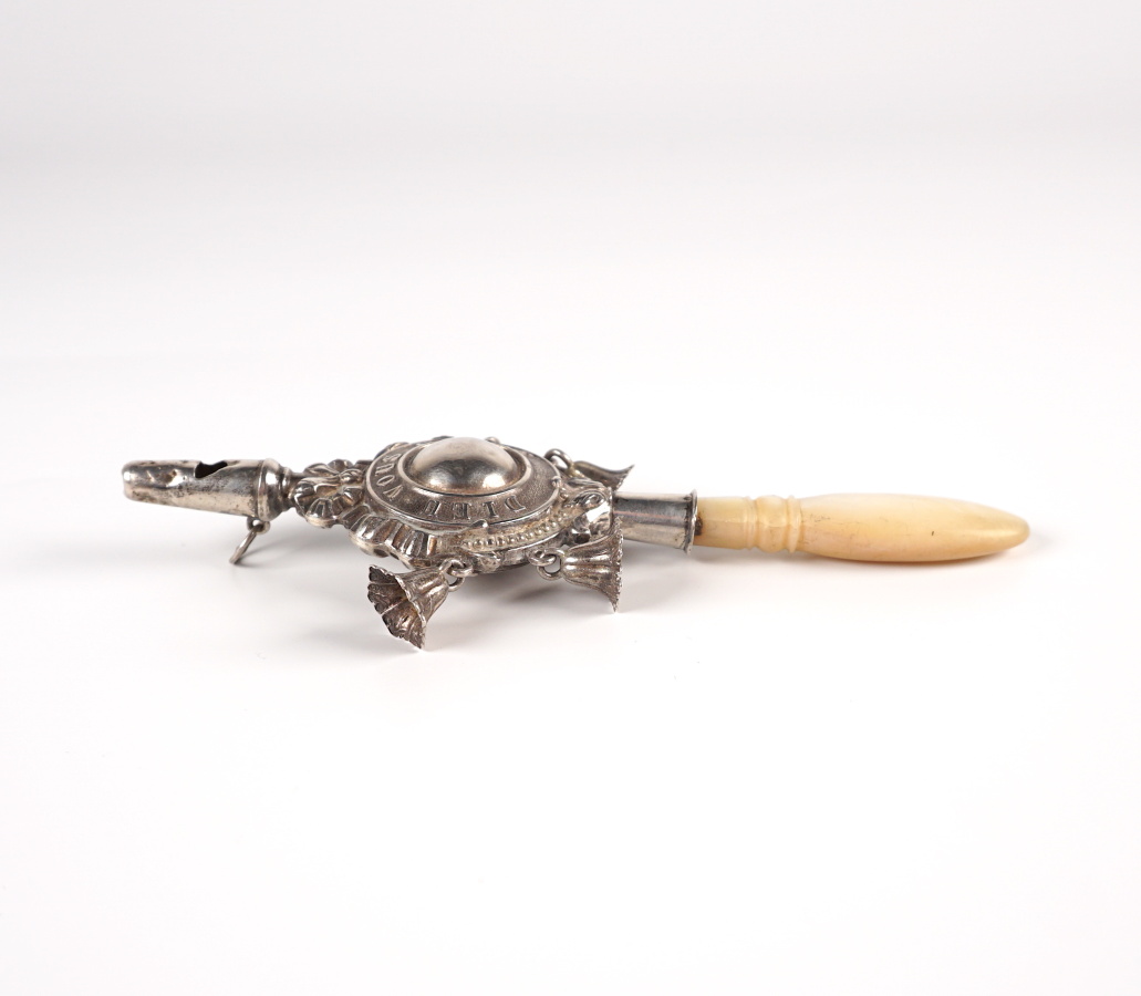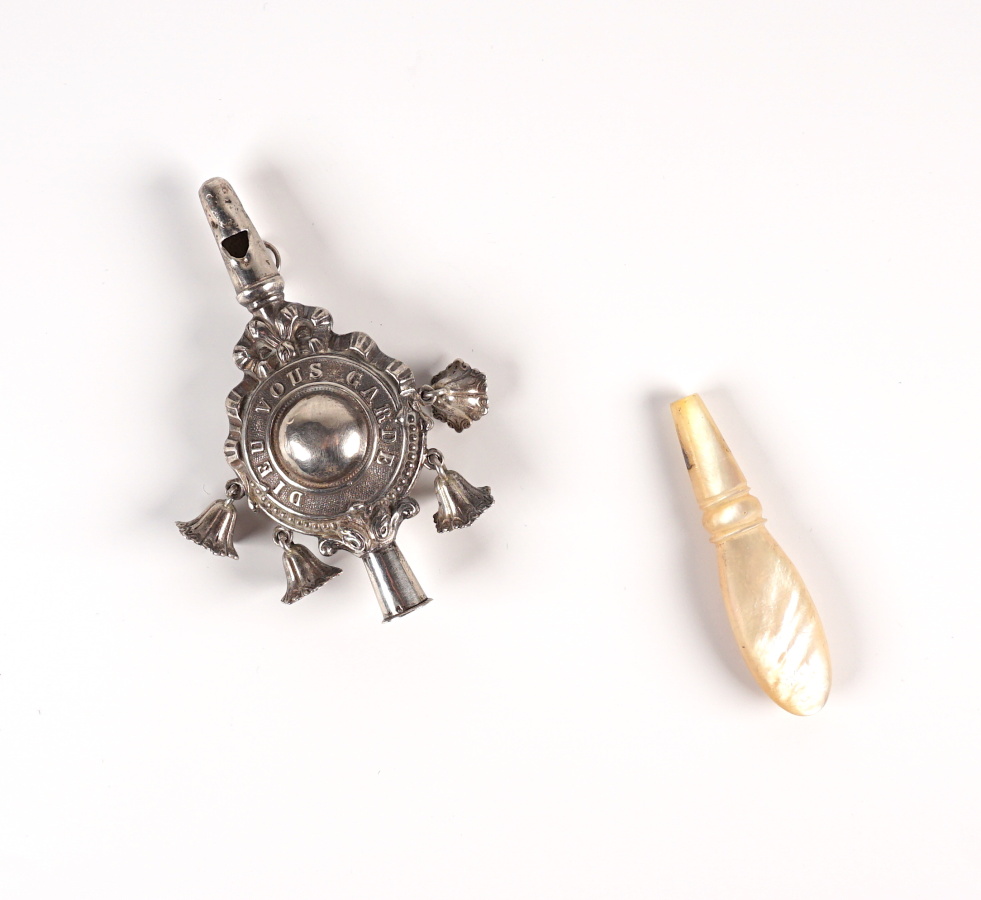 Hochet sifflet en argent (800/oo), poinçon tête de sanglier, le médaillon central marqué "Dieu vous garde" est surmonté d'un ruban noué et retient 4 clochettes, la poignée en nacre amovible, fin 19e - début 20e siècle, L. 13 cm. Poids brut argent : 15.1 g environ.