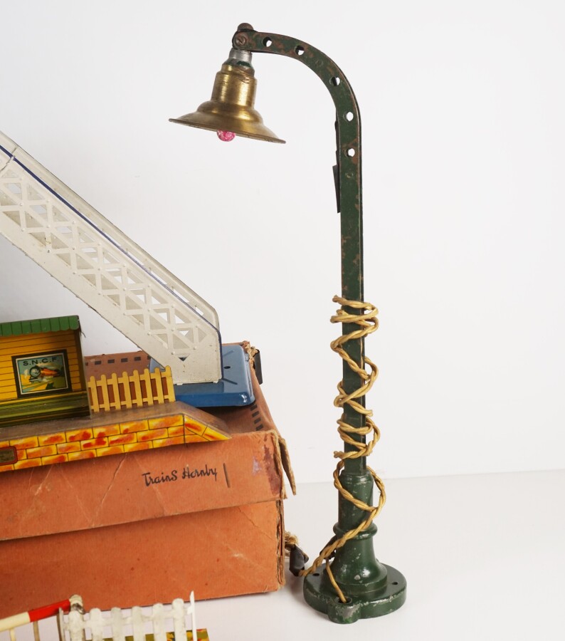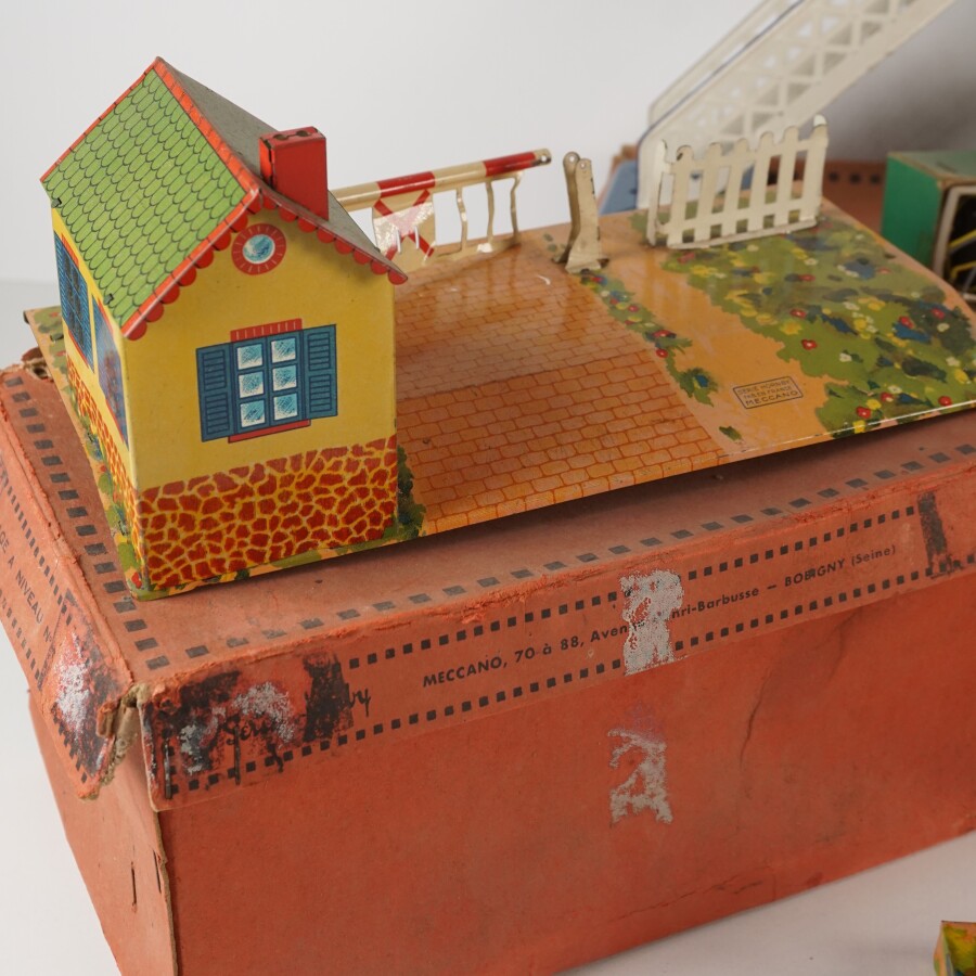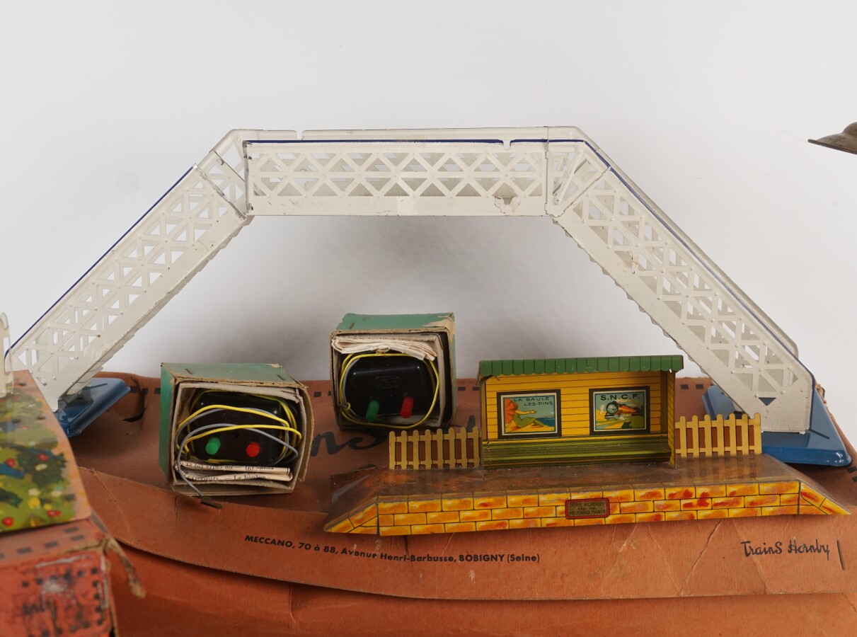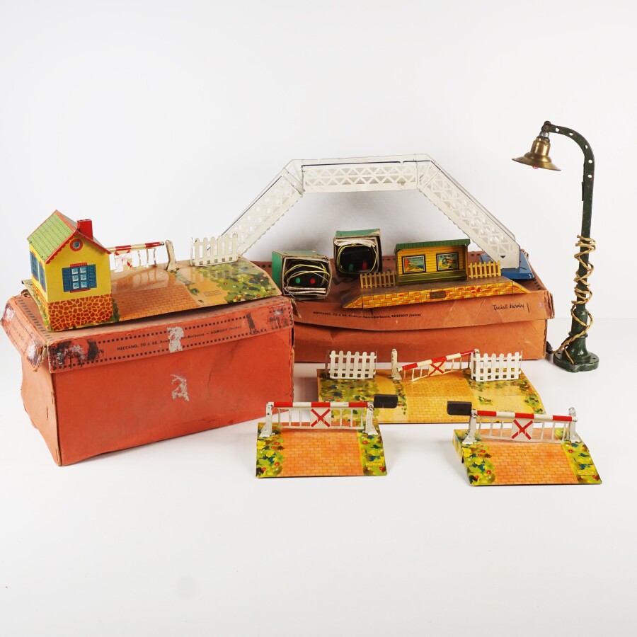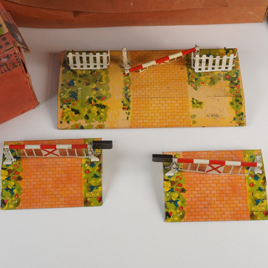 HORNBY : Ensemble comprenant (1) passerelle n°2 avec sémaphores et (1) passage à niveau, dans leurs boîtes d'origine (en l'état).