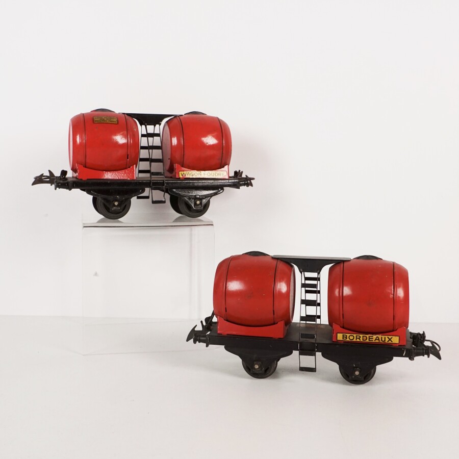 HORNBY : Ensemble en tôle comprenant 2 heurtoirs n°1, 2 wagons foudre bordeaux n° 728, 1 wagon réfrigérant STEF, 1 wagon chevaux bleu, 1 wagon jaune bâché tissu vert "Saint Frères", 1 wagon frigorifique I S, 1 wagon tombeau avec vigie, 1 fourgon n° I-S, 1 wagon bâché n° I, 1 benne basculante, 1 réservoir Essor (certains éléments dans leurs boîtes d'origine usée et déchirées), un élément électrique et rails droits et courbes (usures).