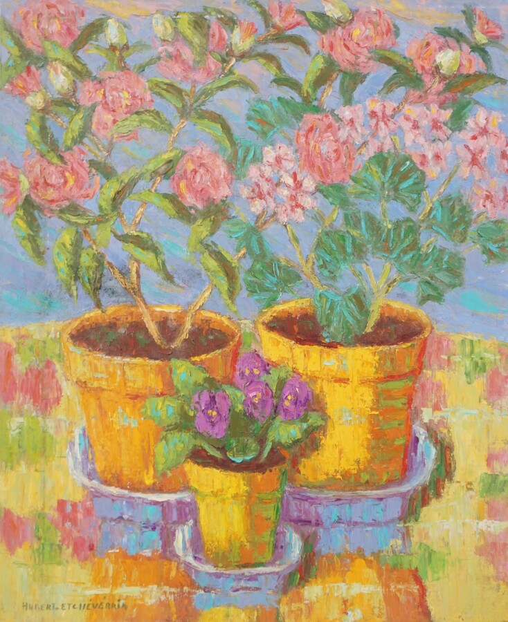 Hubert ETCHEVERRIA (XXe), "Pots de fleurs", huile sur toile signée en bas à droite, 61.5 x 50 cm.