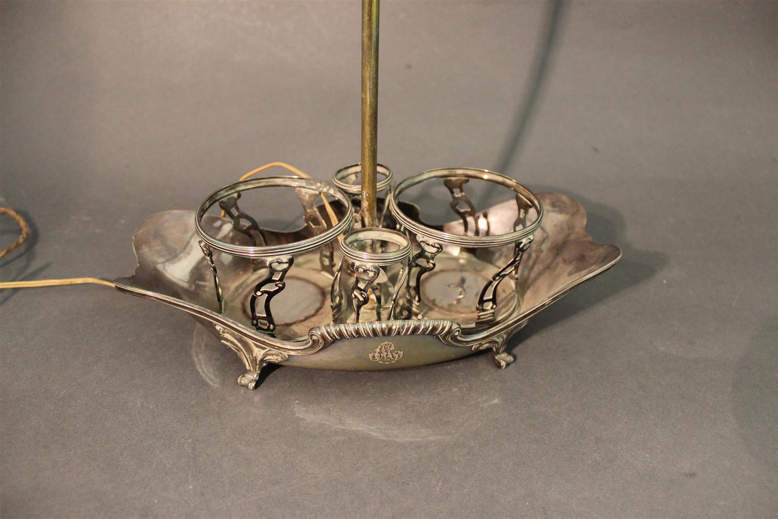 Huilier/vinaigrier, transformé en lampe, en argent massif, poinçons ancien régime, Paris 18e siècle, à décor chiffré "MC", 6 x 15 x H. 36 cm. Poids total brut : 2550 g environ (tige de lampe en métal)