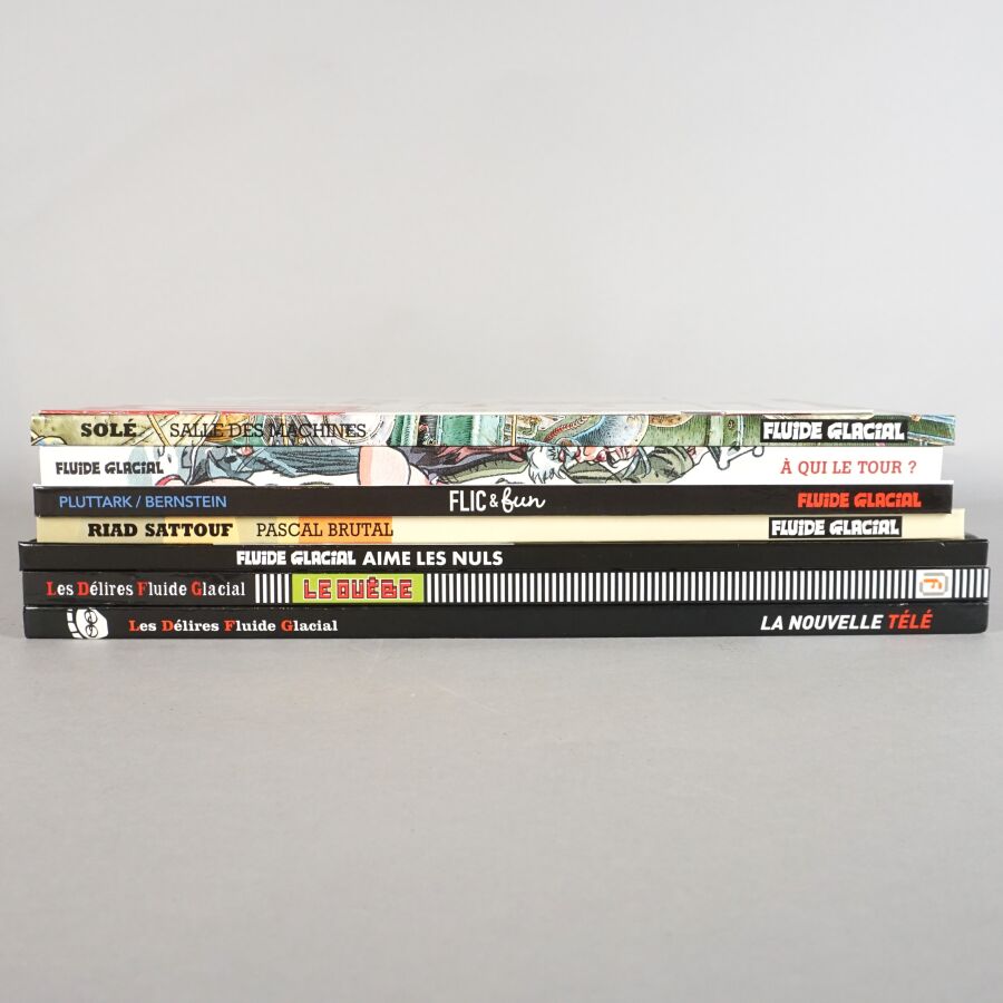HUMOUR - Éd. FLUIDE GLACIAL : Lot de 7 albums comprenant A qui le tour ?, Flic et fun (dédicacé par PLUTTARK), Pascal brutal, Salle des machines, Le ouébe, La nouvelle télé et Fluide Glacial aime les nuls.
