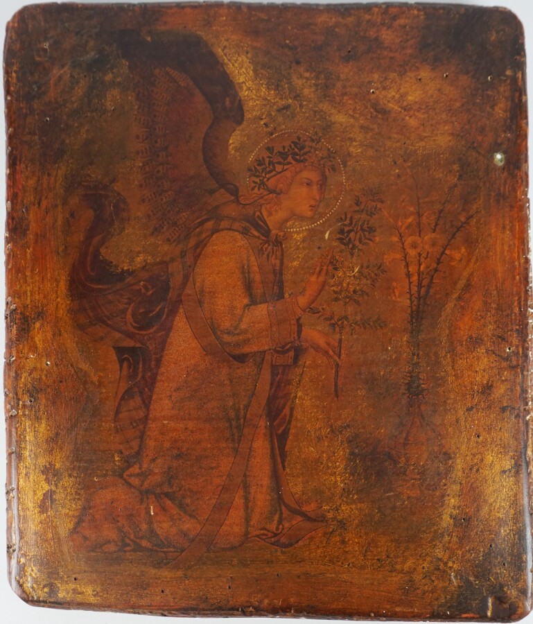 Icône orthodoxe "Ange Gabriel tenant une branche d'olivier", peinture et rehauts d'or sur bois, 19ème siècle, 32 x 27 cm (usures, manques).