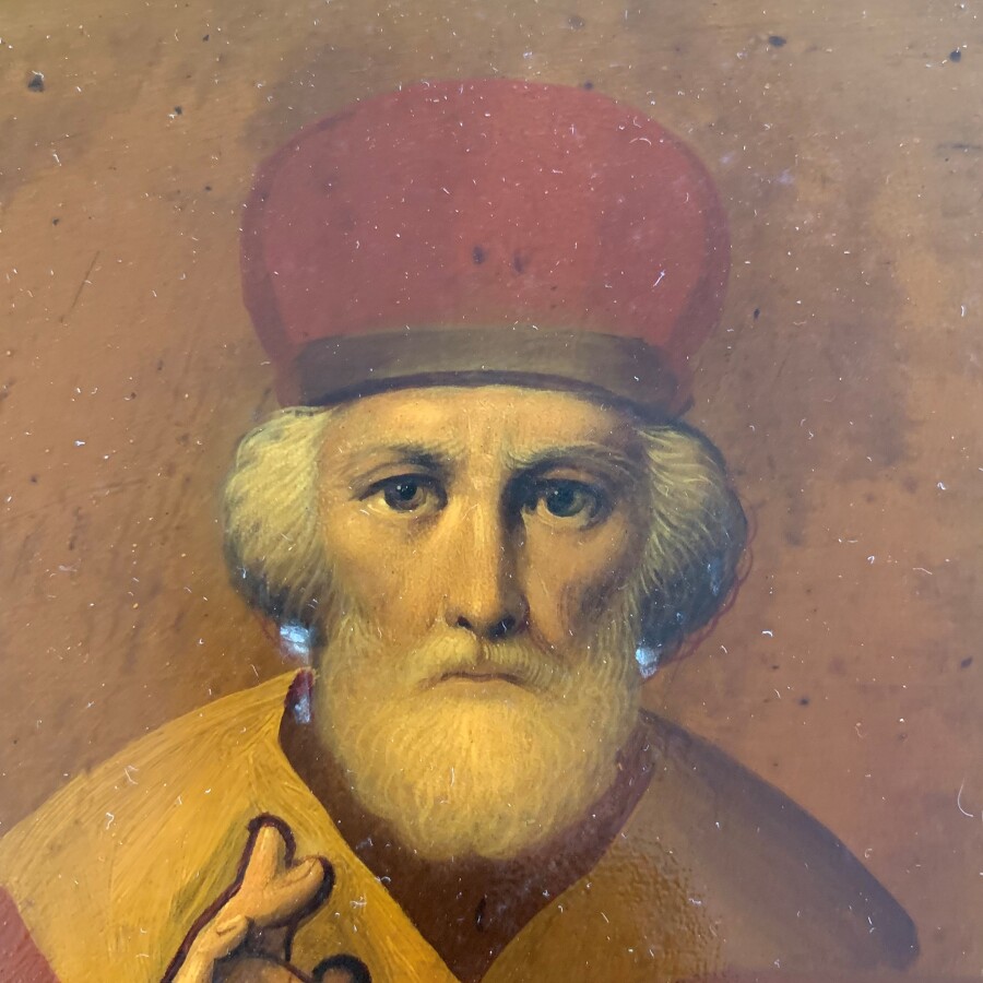 Icône " Saint Nicolas ", huile sur métal, oklad en argent et vermeille, Russie, début XXe siècle