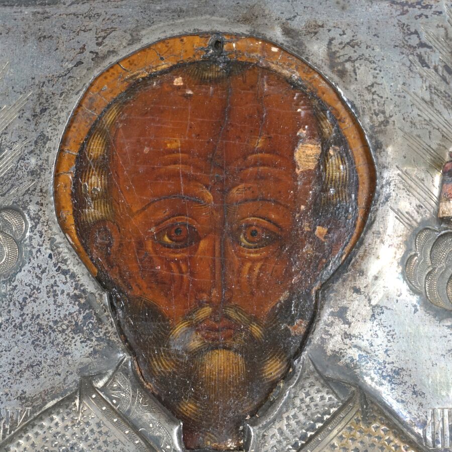 Icône "Saint Nicolas", tempera sur bois, oklad en métal argenté et repoussé, Russie, début du 19e siècle, Dim. 34 x 26 cm, A.B.E (la couronne manquante, écaillures).