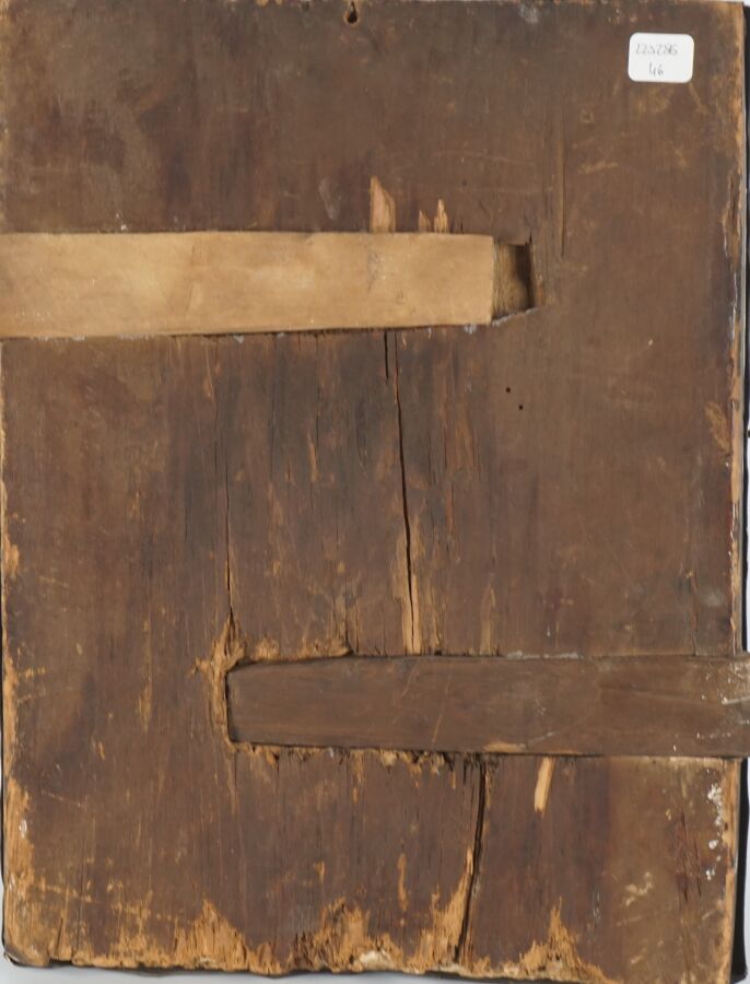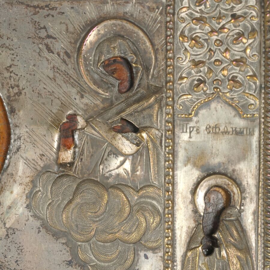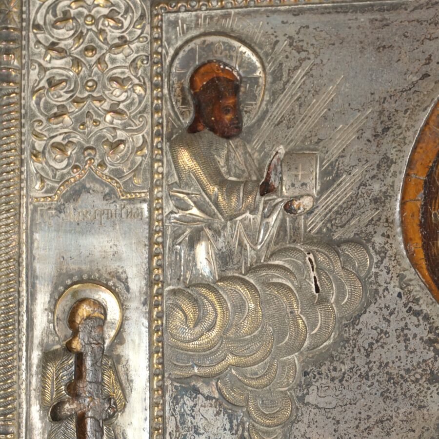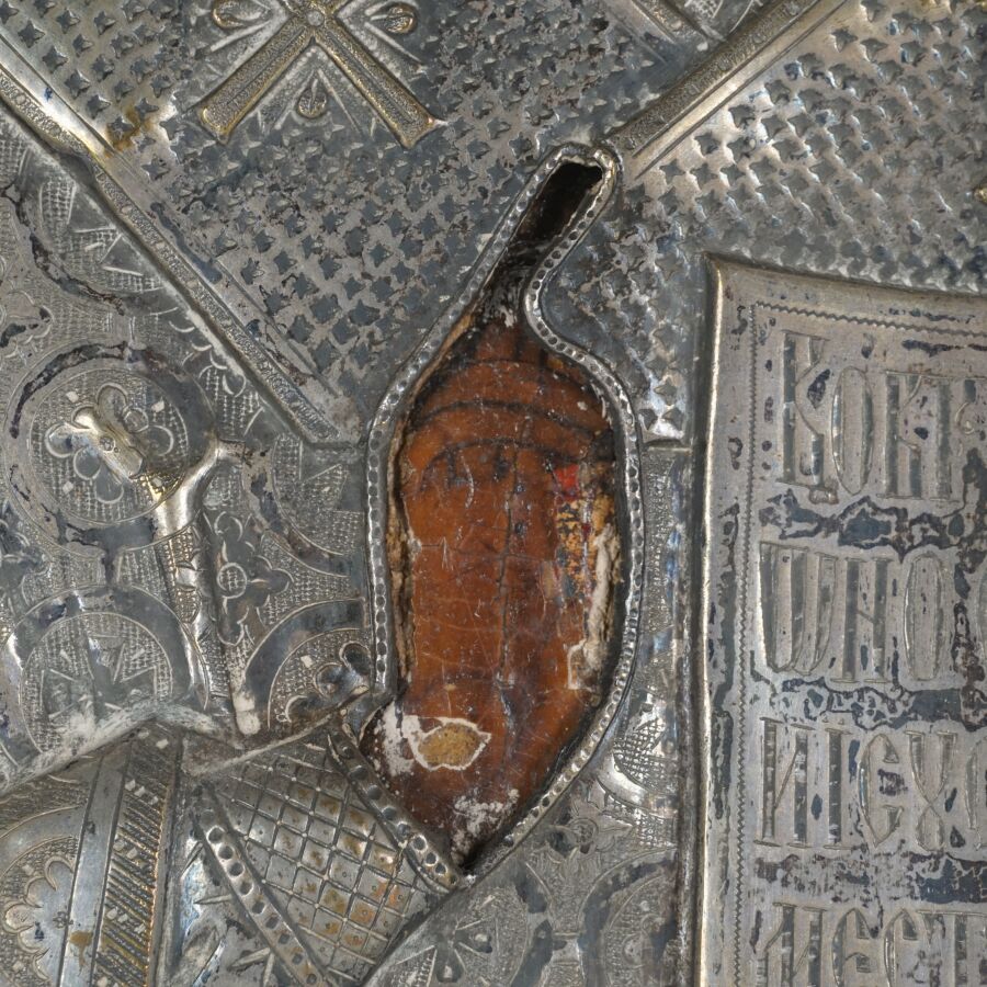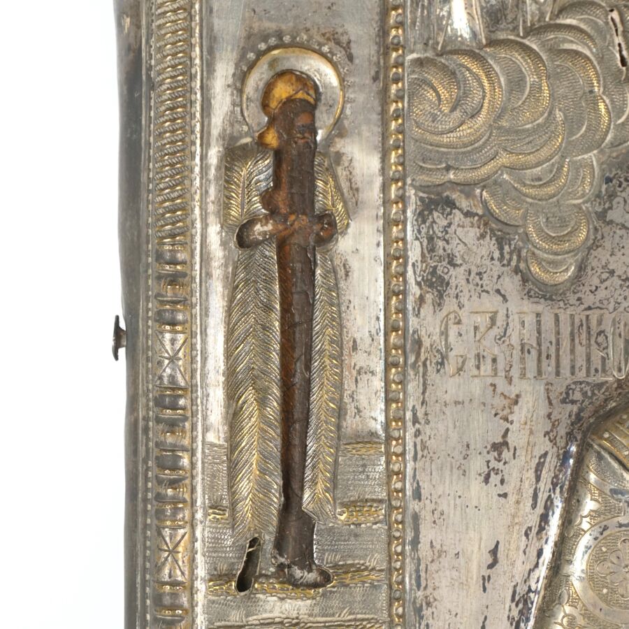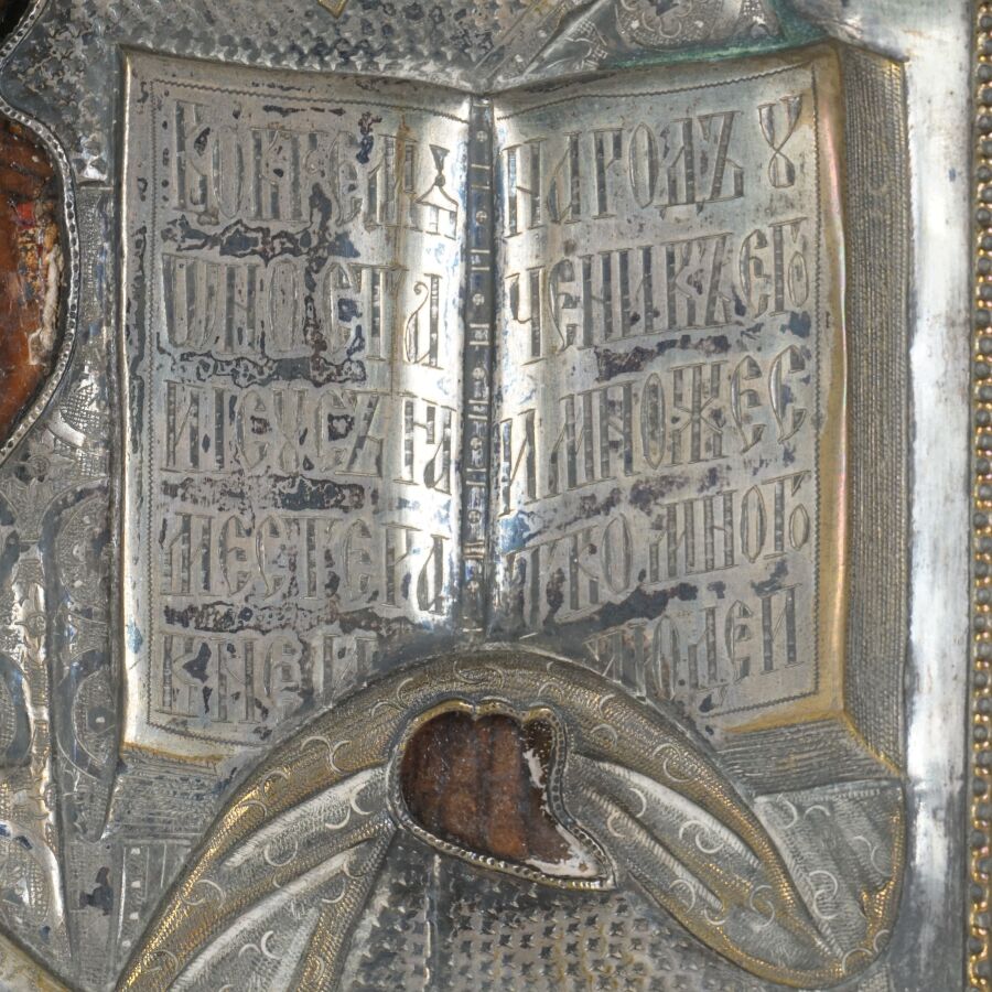 Icône "Saint Nicolas", tempera sur bois, oklad en métal argenté et repoussé, Russie, début du 19e siècle, Dim. 34 x 26 cm, A.B.E (la couronne manquante, écaillures).