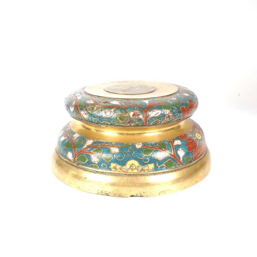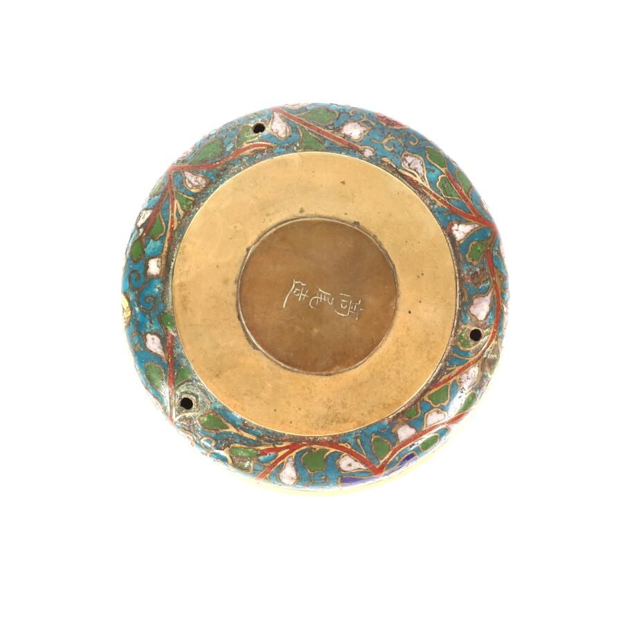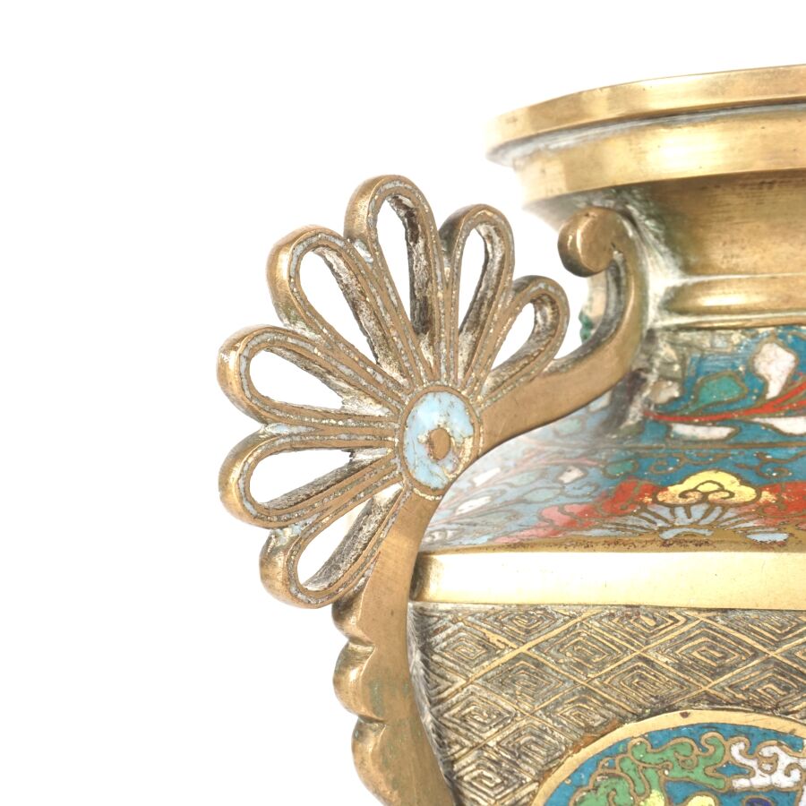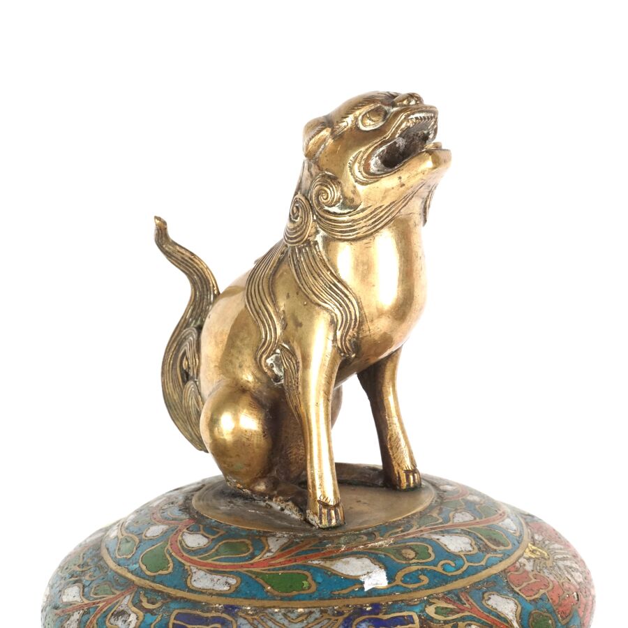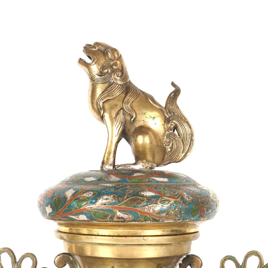 Important brûle-parfum en trois éléments en bronze et émaux cloisonnés polychrome, la partie centrale tripode ornée de deux médaillons en léger bas-relief de volatiles et caractères calligraphiques, le couvercle surmonté d'une prise à motif d'un lion bouddhique, Japon, début du 20ème siècle, H. Totale : 54 cm (petites usures et petites traces d'oxydation).