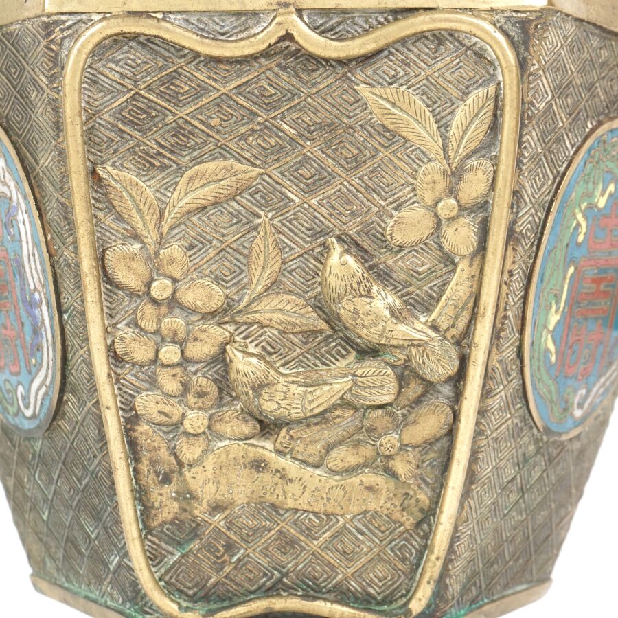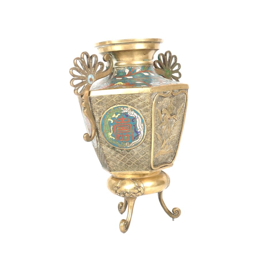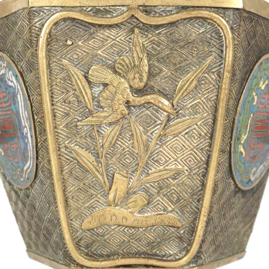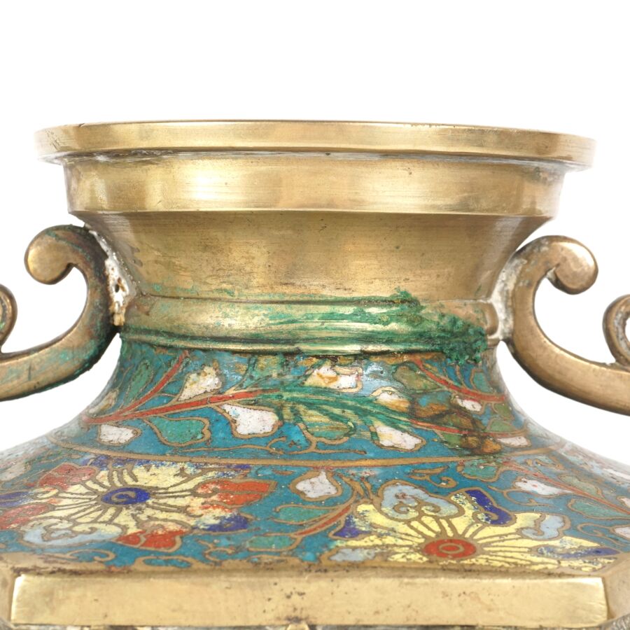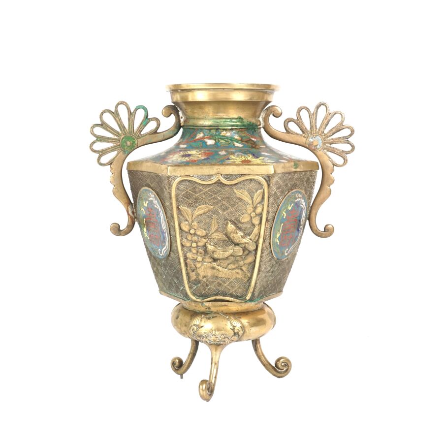 Important brûle-parfum en trois éléments en bronze et émaux cloisonnés polychrome, la partie centrale tripode ornée de deux médaillons en léger bas-relief de volatiles et caractères calligraphiques, le couvercle surmonté d'une prise à motif d'un lion bouddhique, Japon, début du 20ème siècle, H. Totale : 54 cm (petites usures et petites traces d'oxydation).