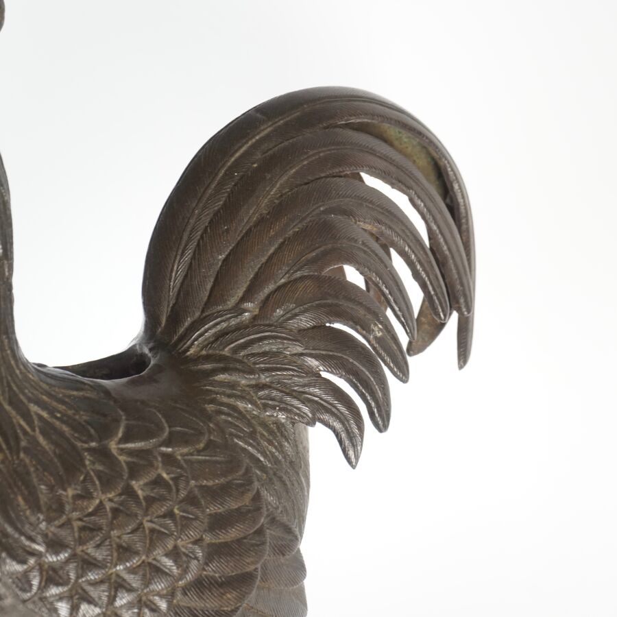 Important brûle-parfums, en bronze, représentant un coq sur un tambourin à décor d'un dragon et phénix affrontés autour du " mitsu tomoe " composé de trois magatama disposés en cercle, présenté sur un support en bronze reposant sur quatre pieds en volute, Japon, fin de la période Meiji (1868-1912), H. 71,5 cm (oxydations et manque un couvercle).