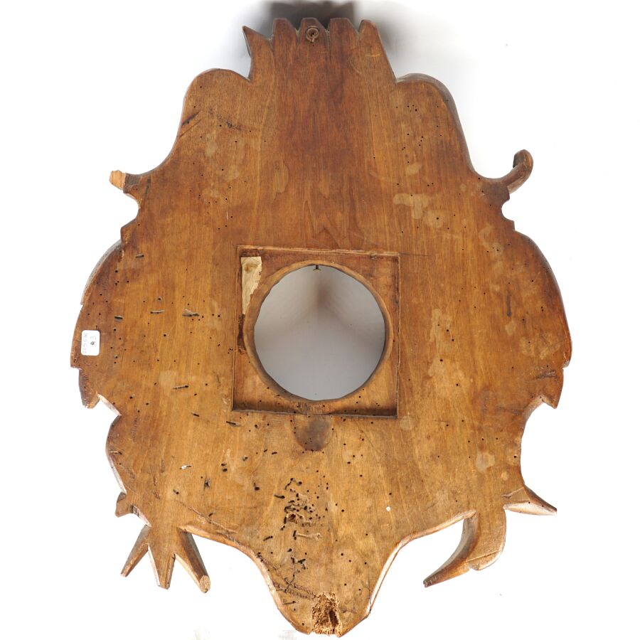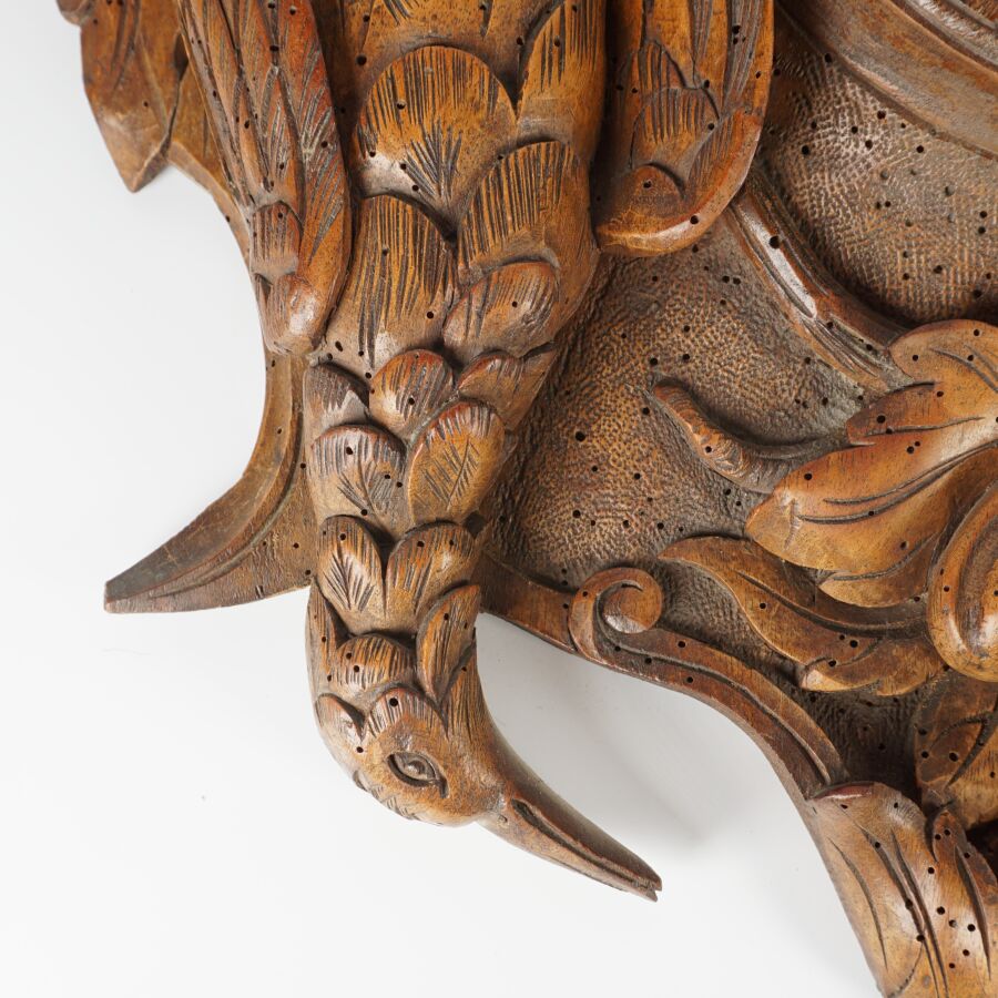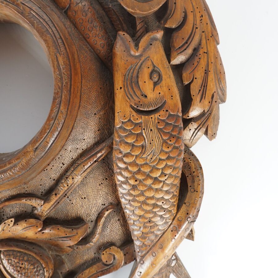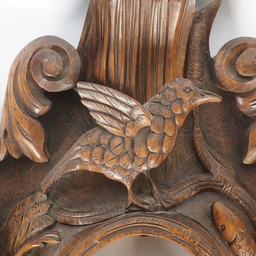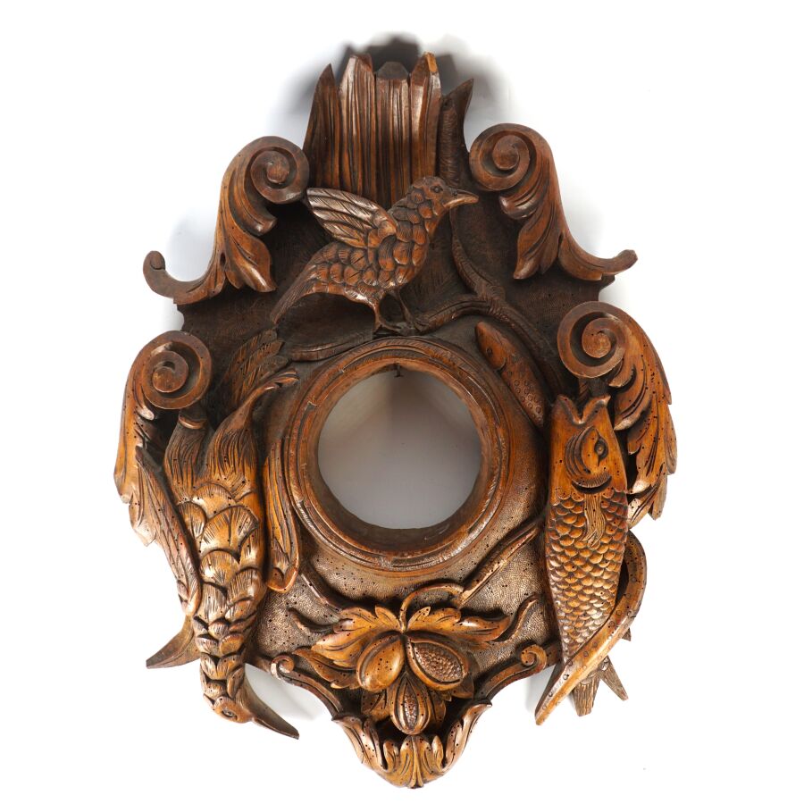 Important cadre en bois de noyer sculpté à décor de volatiles et poissons, circa 1930, volatiles et poissons 58 x 45 cm.