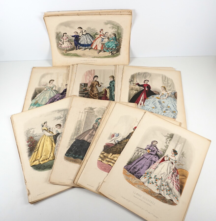Important ensemble de gravures de mode 19e siècle en couleurs In folio + un recueil Journal des femmes (1 volume in 8 avec gravures couleurs).