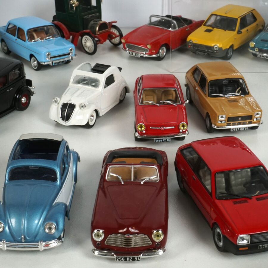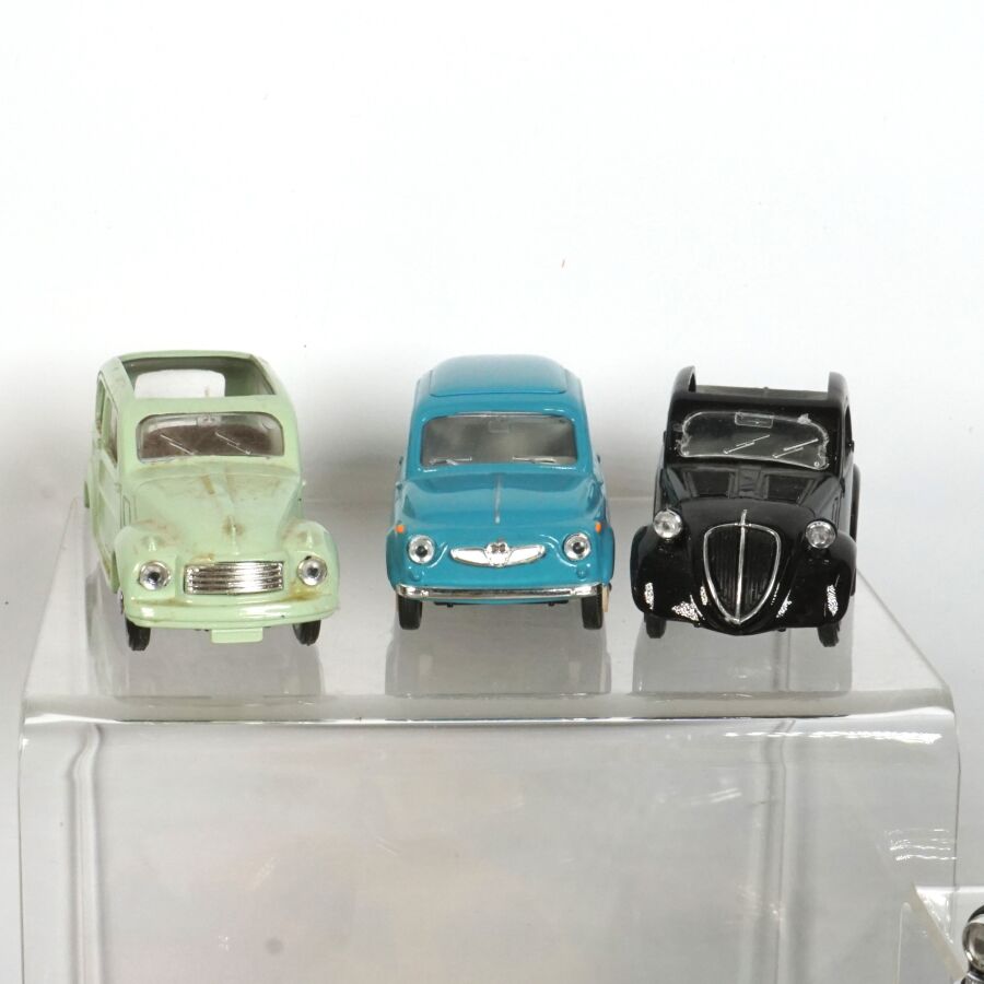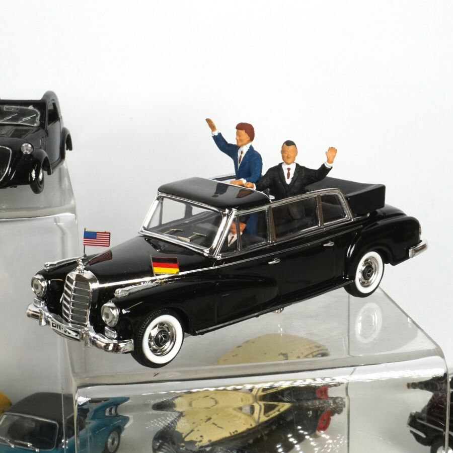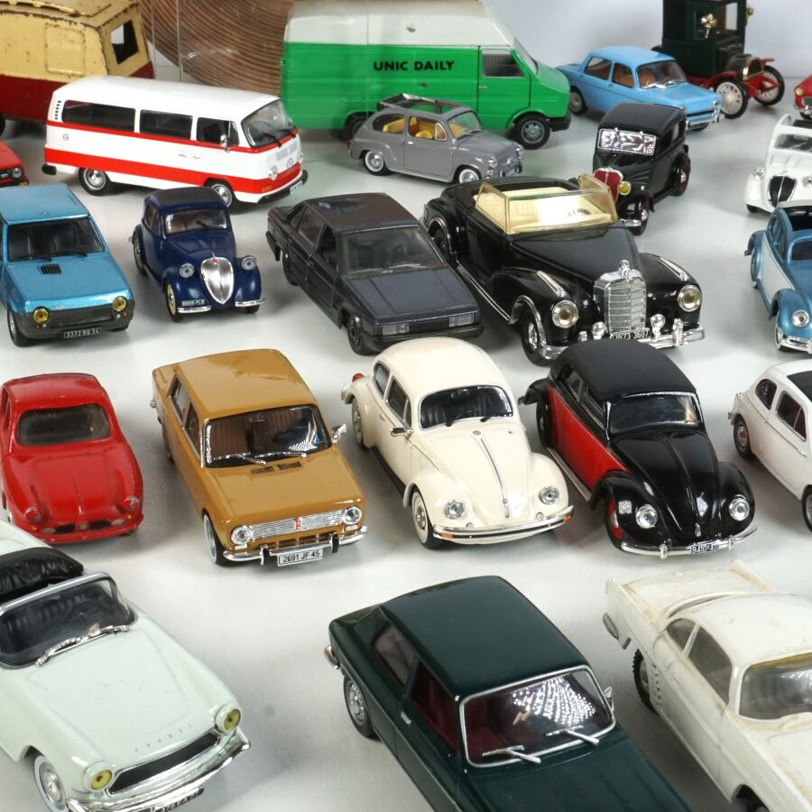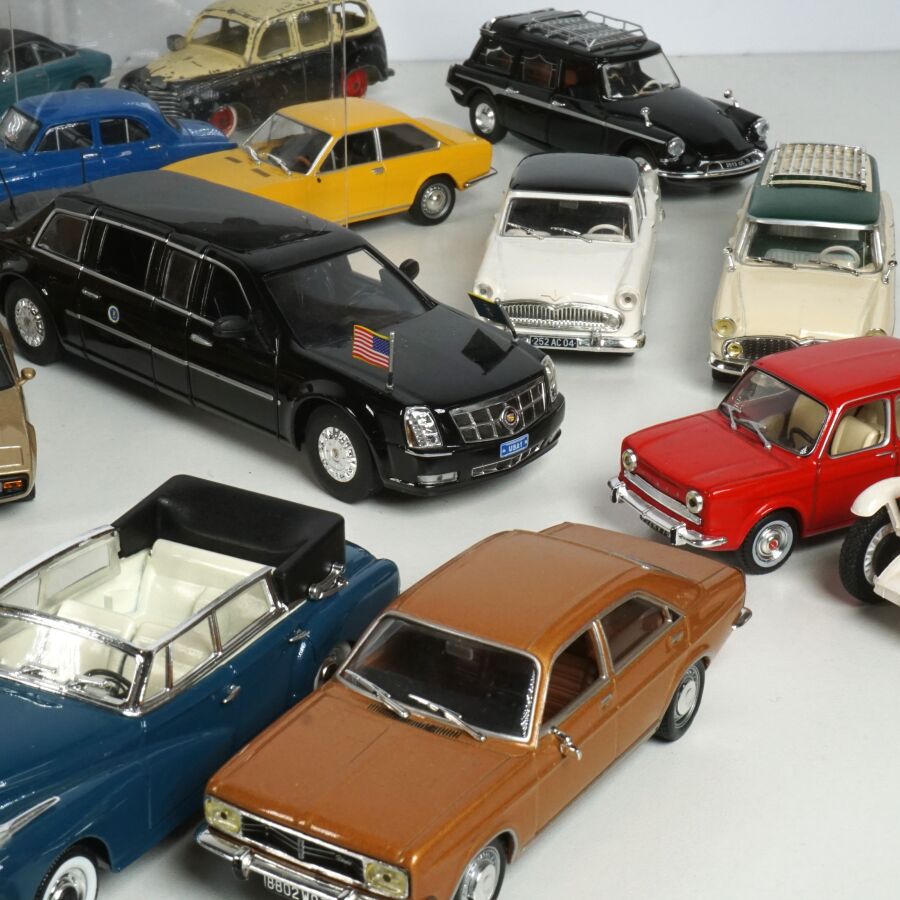 Important ensemble d'environ 160 véhicules divers, échelle 1/43ème, comprenant notamment (1) Simca Fiat 6CV, noire ; (1) LUXURY DIE-CAST : Cadillac Presidential Limo, noire ; (1) Volkswagen Kombi, blanche et rouge ; (1) Fiat 600 vert clair ; (1) RIO : Mercedes-Benz Typ 300, réf. W189, bleue ; et divers (en l'état, usures, écaillures, accidents).