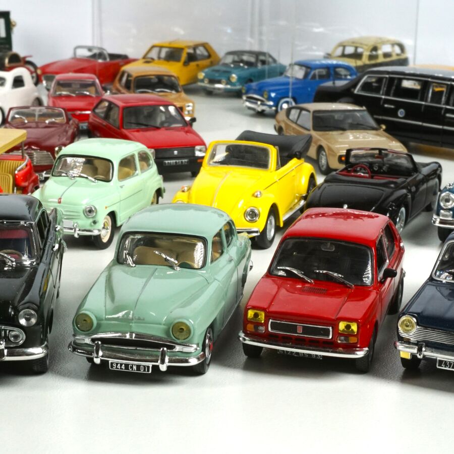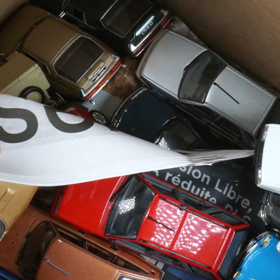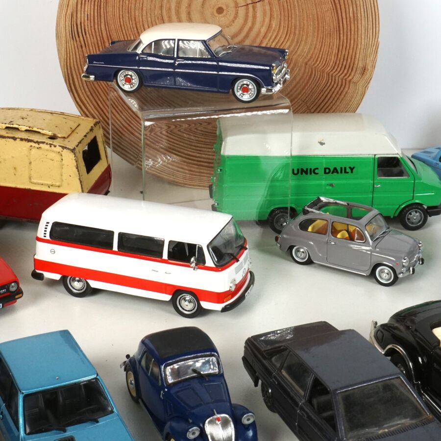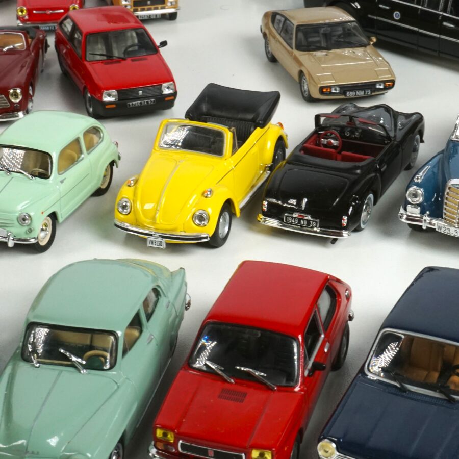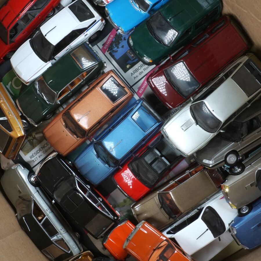 Important ensemble d'environ 160 véhicules divers, échelle 1/43ème, comprenant notamment (1) Simca Fiat 6CV, noire ; (1) LUXURY DIE-CAST : Cadillac Presidential Limo, noire ; (1) Volkswagen Kombi, blanche et rouge ; (1) Fiat 600 vert clair ; (1) RIO : Mercedes-Benz Typ 300, réf. W189, bleue ; et divers (en l'état, usures, écaillures, accidents).