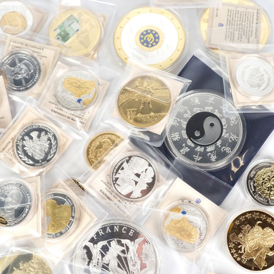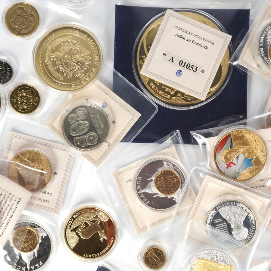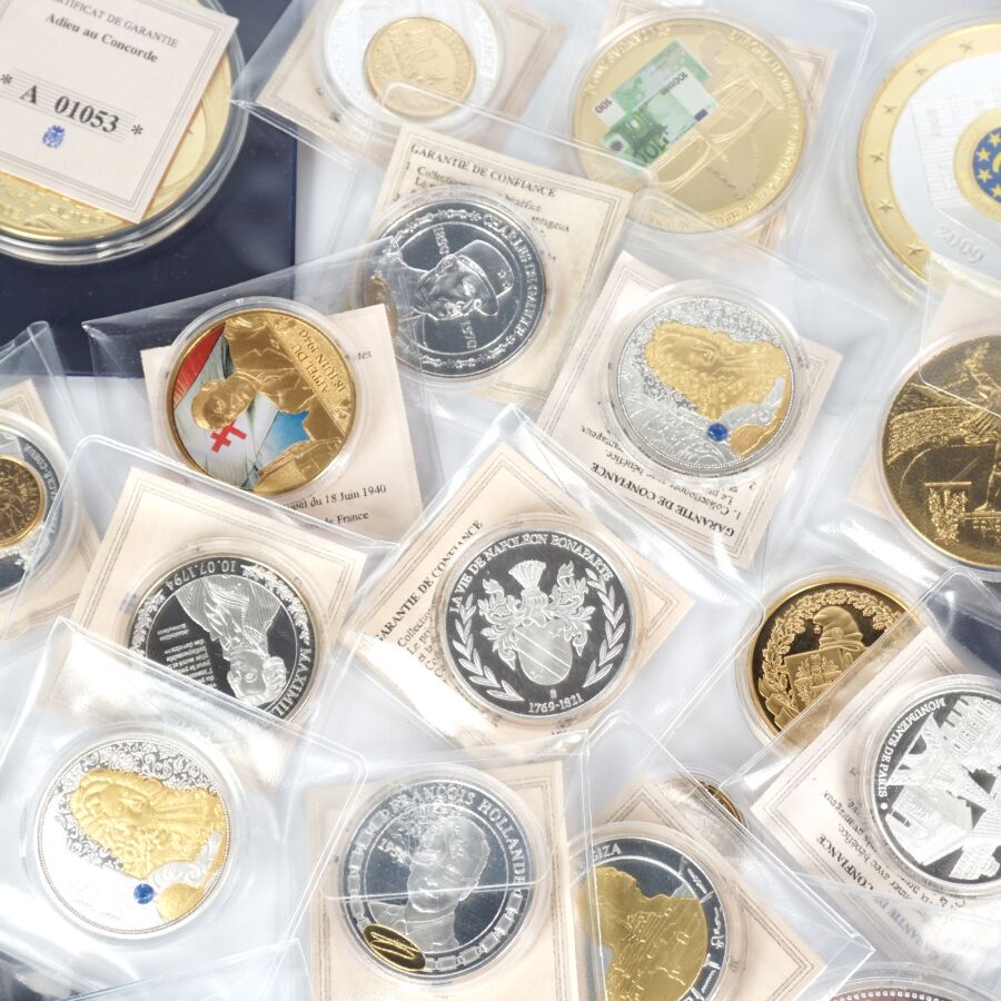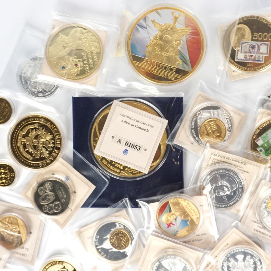 Important lot de 49 médailles commémoratives sur différents thèmes tels que : Franc, Histoire de france, Euro, Histoire monnétaire, Zodiac chinois, Concorde etc. Quelques très gros modules.