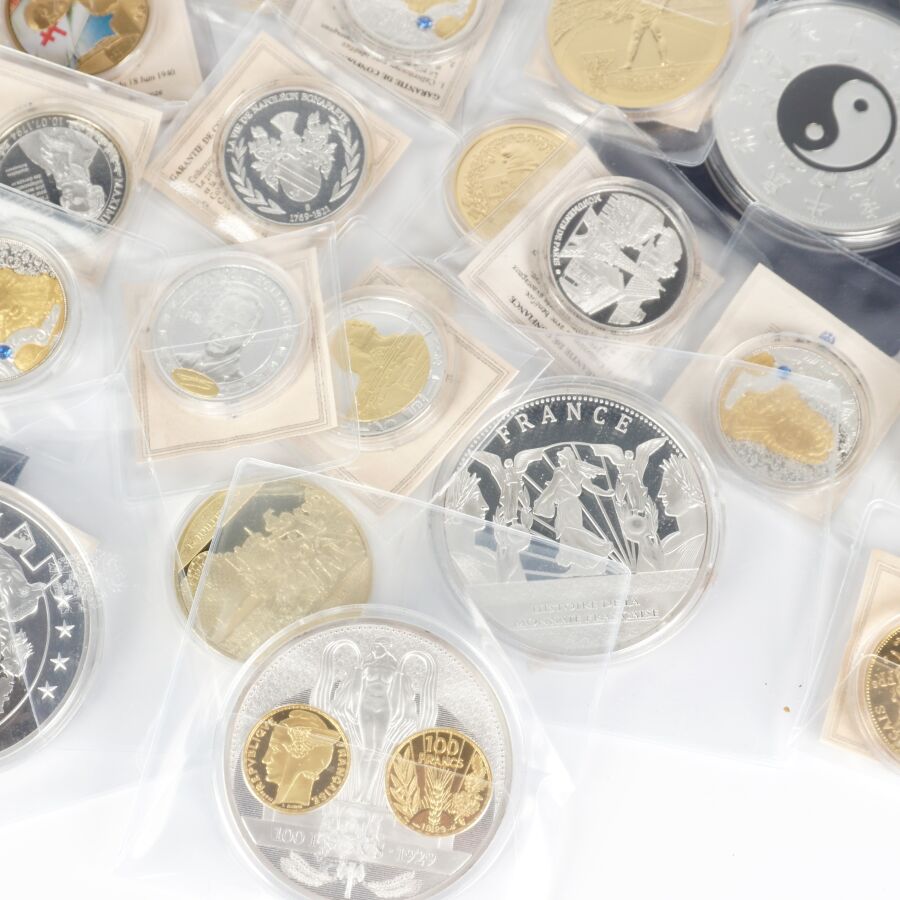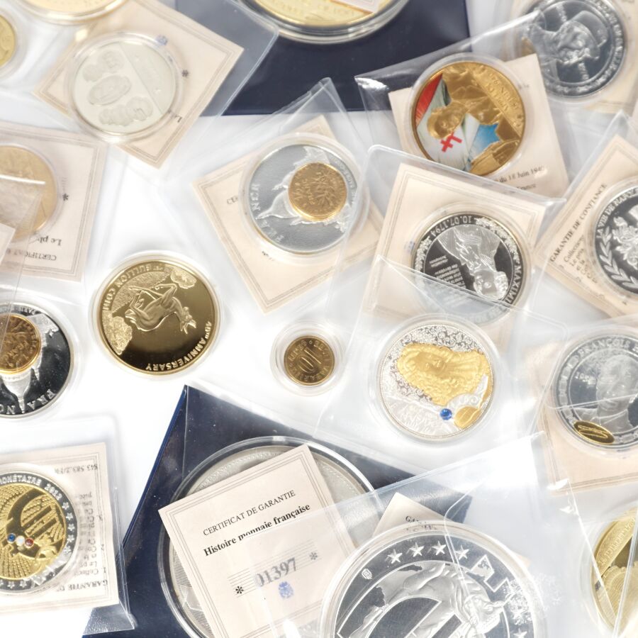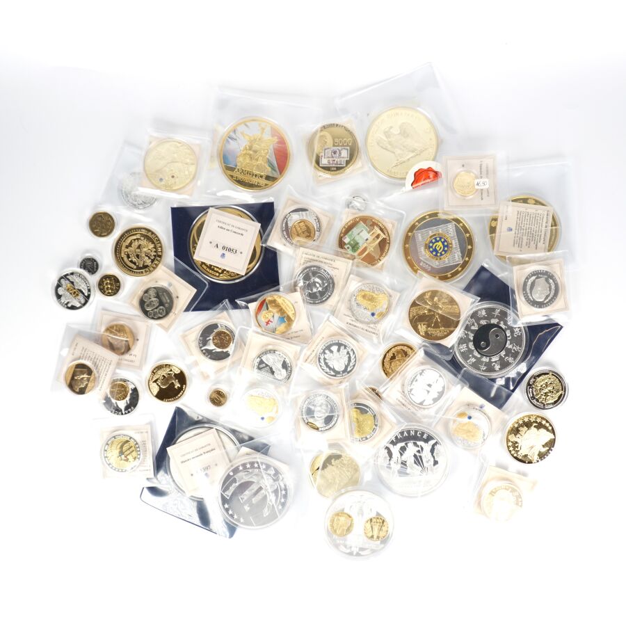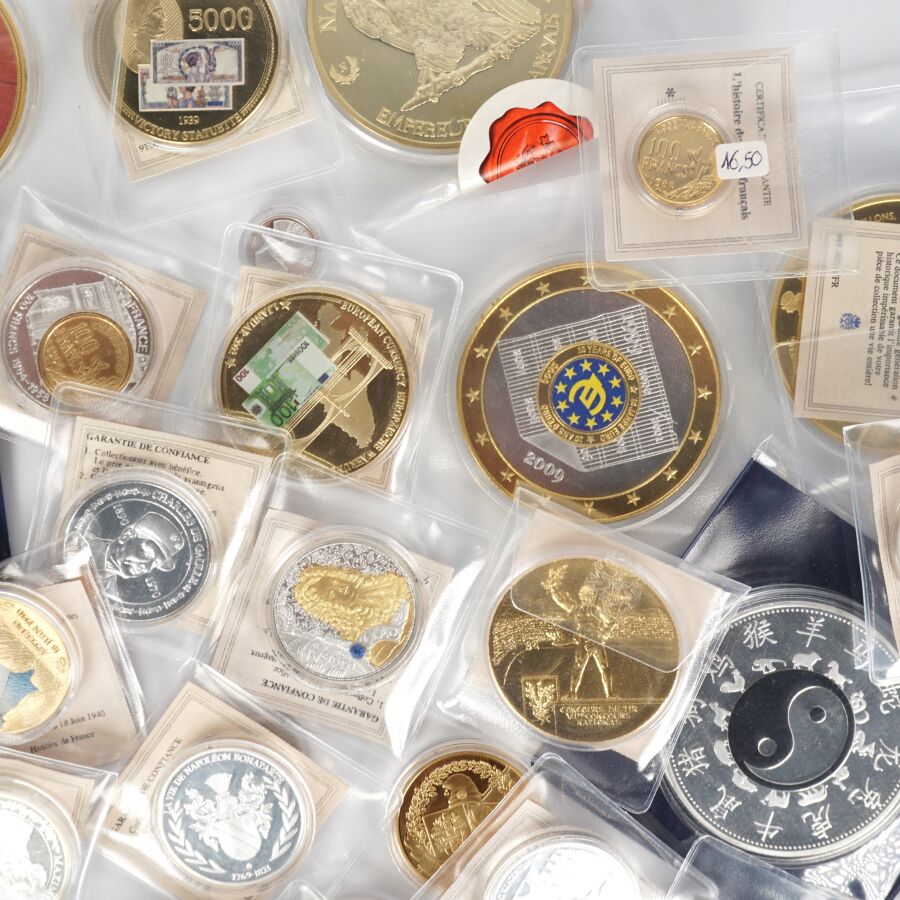 Important lot de 49 médailles commémoratives sur différents thèmes tels que : Franc, Histoire de france, Euro, Histoire monnétaire, Zodiac chinois, Concorde etc. Quelques très gros modules.