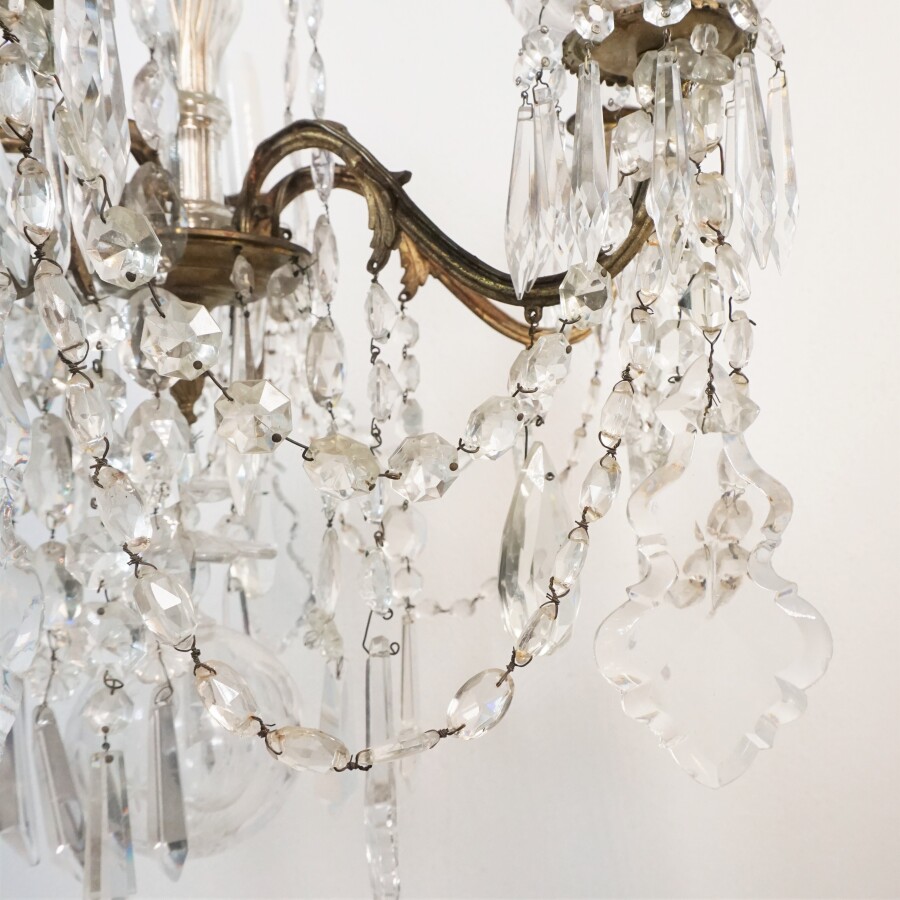 Important lustre à six bras de lumière en verre, agrémenté de guirlandes et de pampilles, orné de fleurettes en partie supérieure, H.90 cm (usures, manques et éclats).