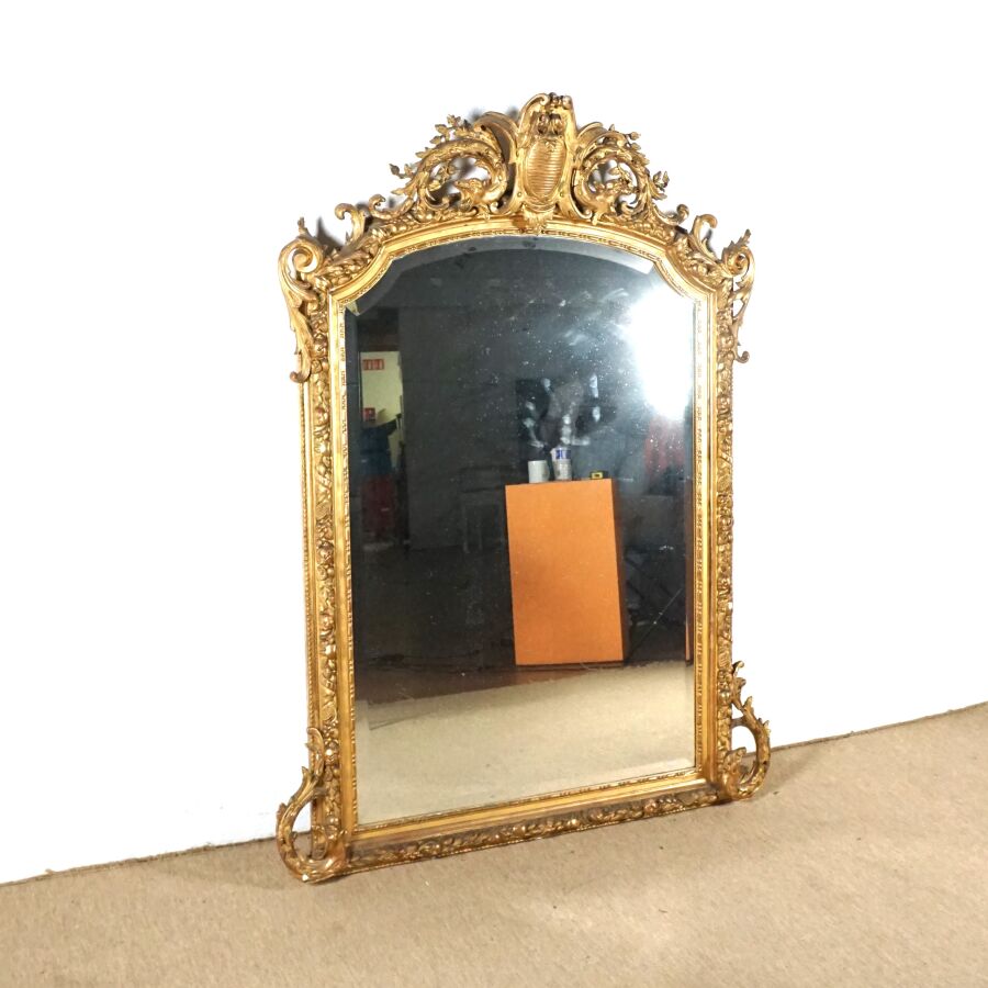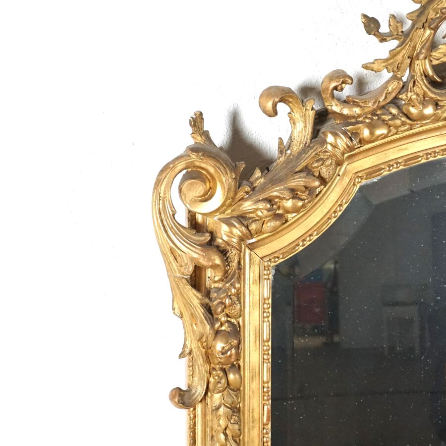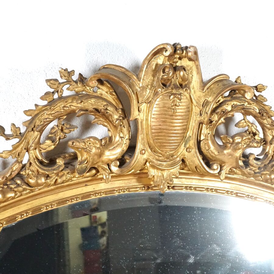 Important miroir, encadrement en bois doré et sculpté, feuillage à l'amortissement, H. 156 x 106 cm (petites usures, manques).