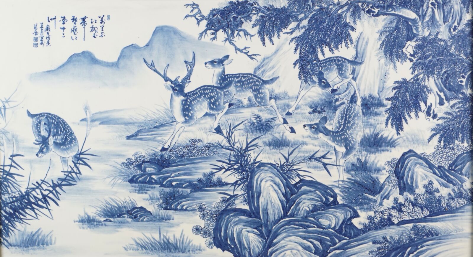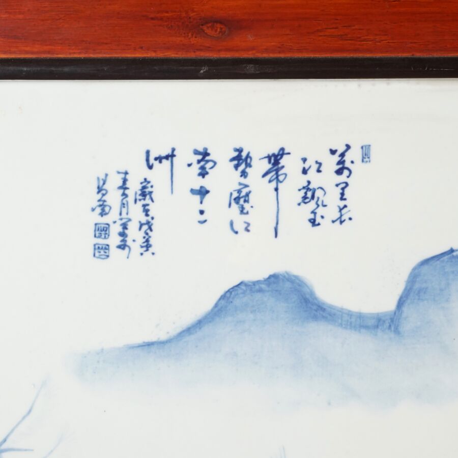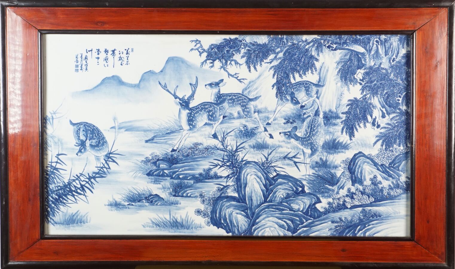 Important panneau en porcelaine blanche à décor émaillé en bleu sous couverte d'une famille de daims se promenant sur les berges arborées d'une rivière, entourée de pics montagneux, poème en haut à gauche sur le beau paysage de la rivière Yangtsu, Chine, fin du 20ème siècle, 43 x 78,5 cm.