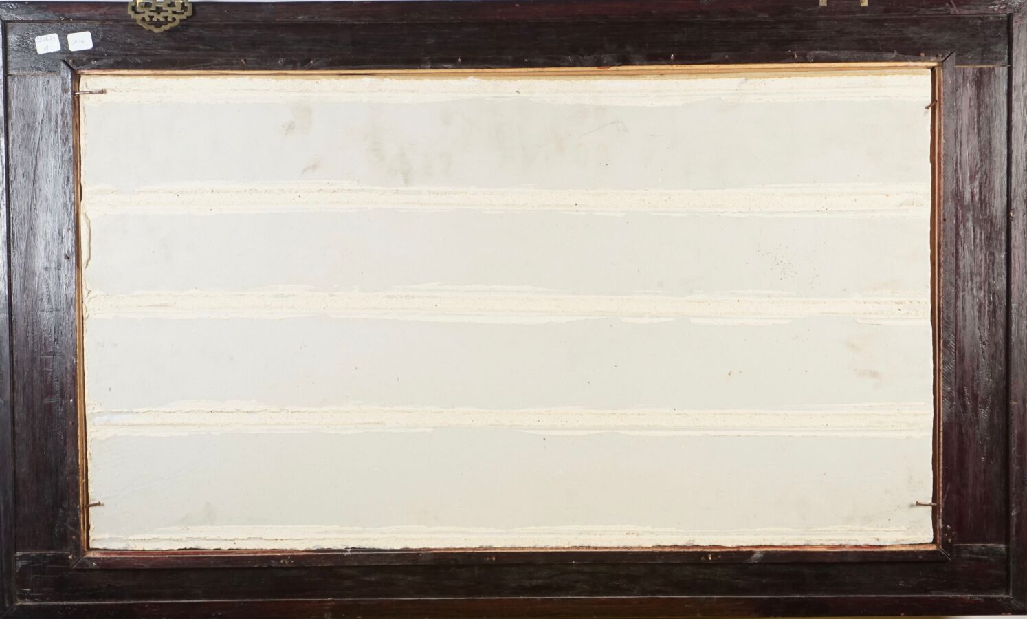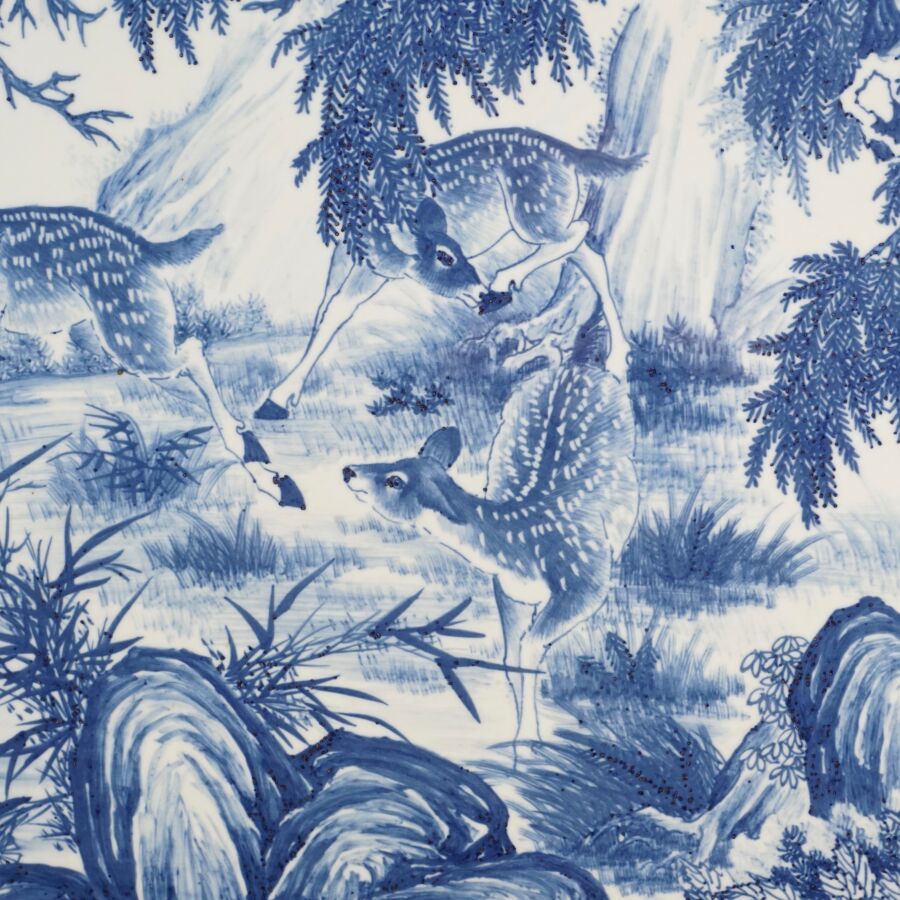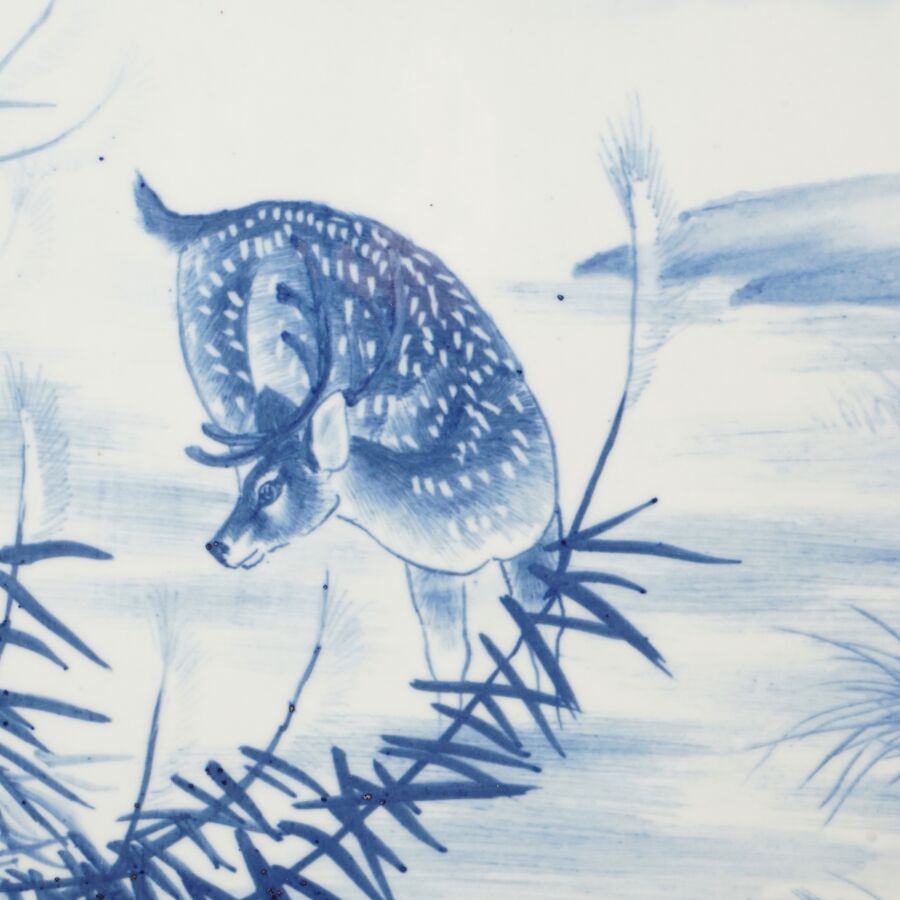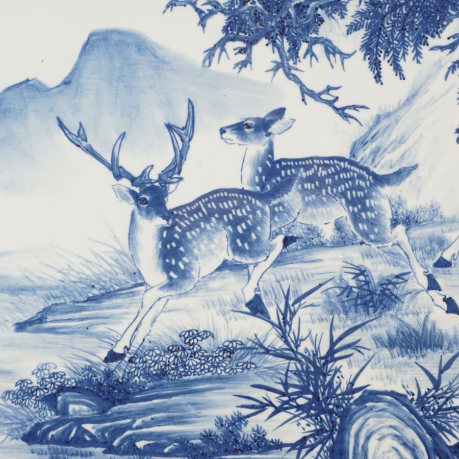 Important panneau en porcelaine blanche à décor émaillé en bleu sous couverte d'une famille de daims se promenant sur les berges arborées d'une rivière, entourée de pics montagneux, poème en haut à gauche sur le beau paysage de la rivière Yangtsu, Chine, fin du 20ème siècle, 43 x 78,5 cm.