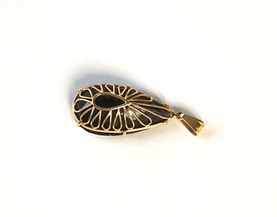 Important pendentif "Goutte" en or jaune 18K (750/oo) serti d'un quartz fumé taille poire, H. 5 cm. Poids brut : 12.2 g environ.