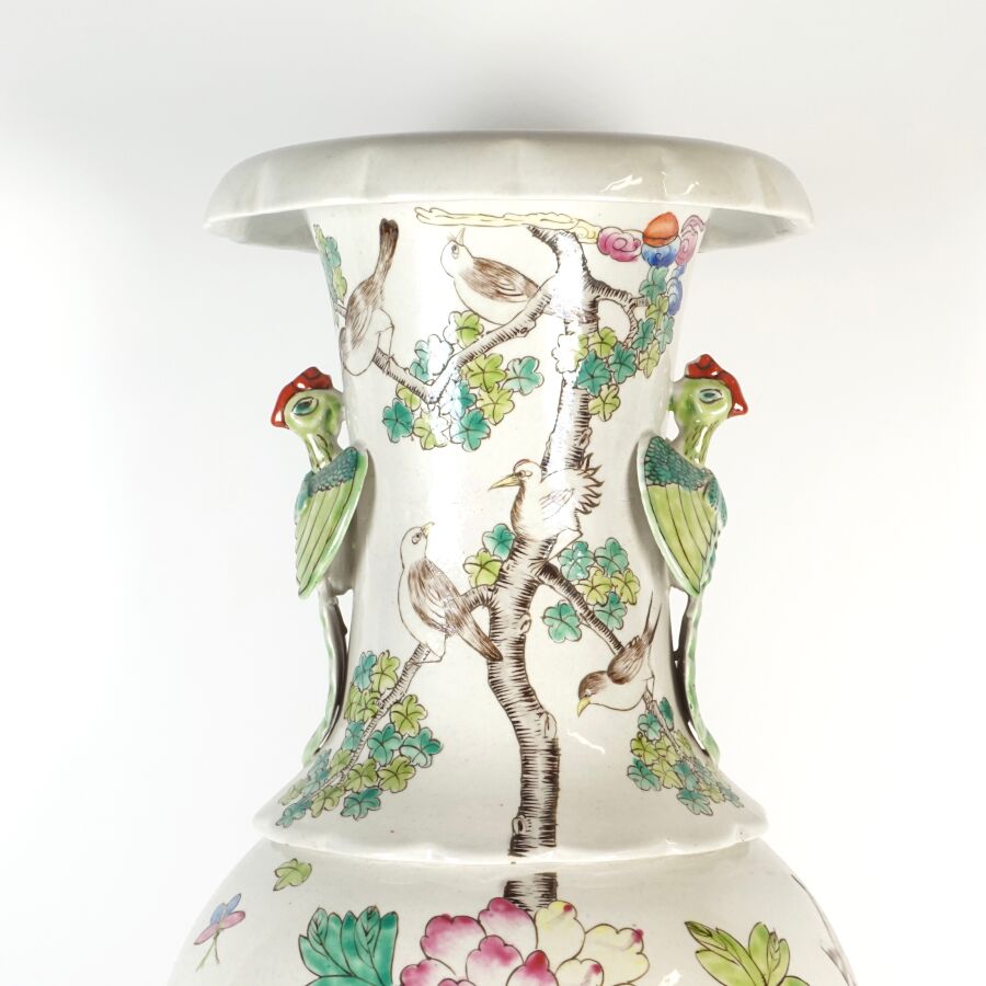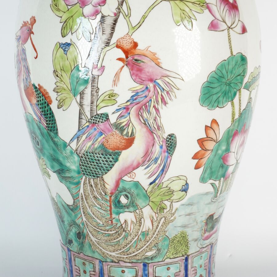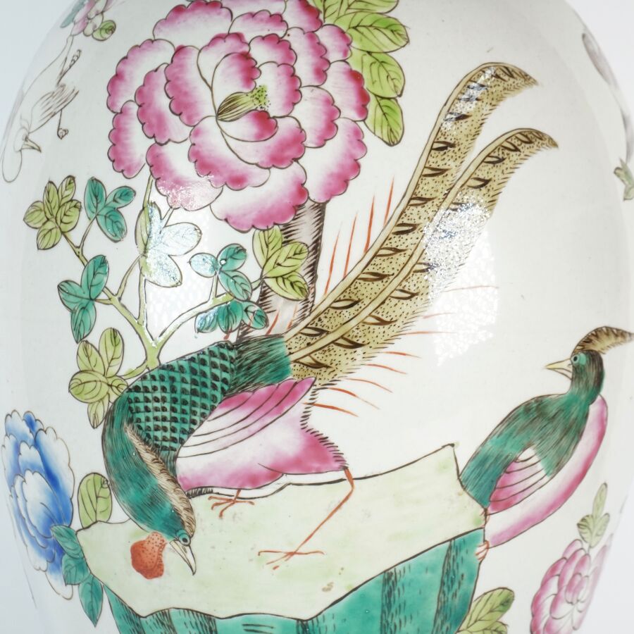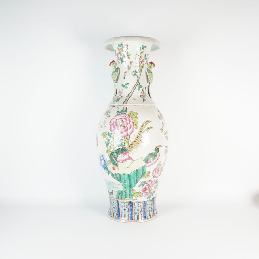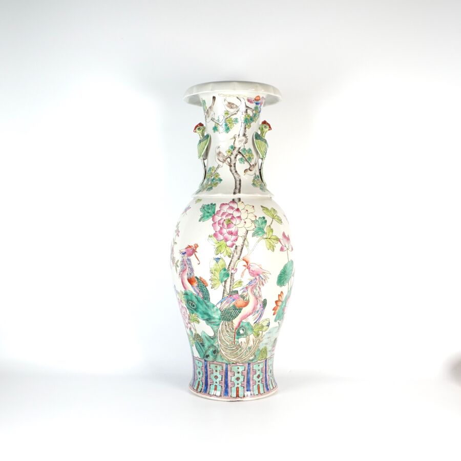 Important vase de forme balustre à col ourlé en porcelaine et émaux de style famille rose à décor de faisans et d'un couple d'oiseaux paradis perchés sur une roche, entourés de pivoines, le col orné de phenix en relief, Chine, milieu du 20ème siècle, H. 62 cm.